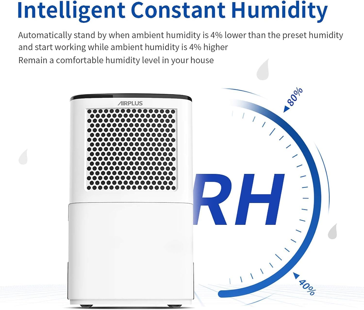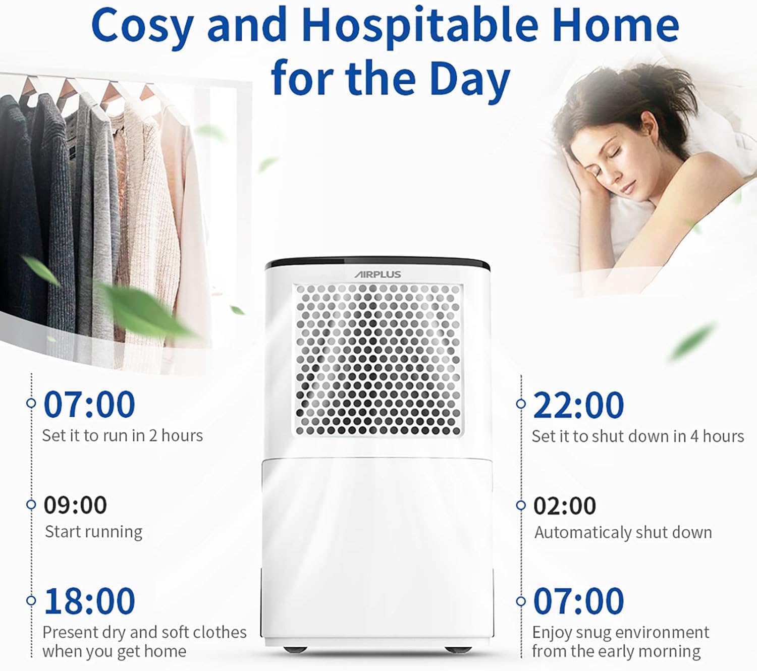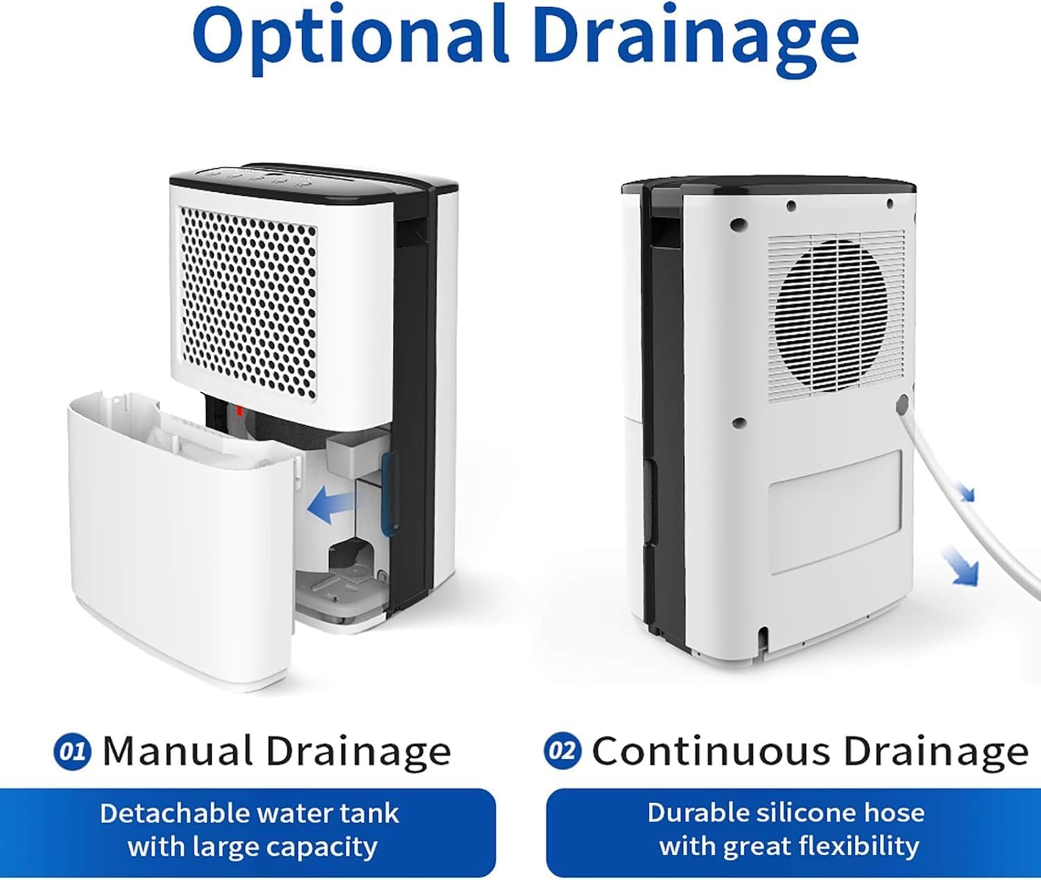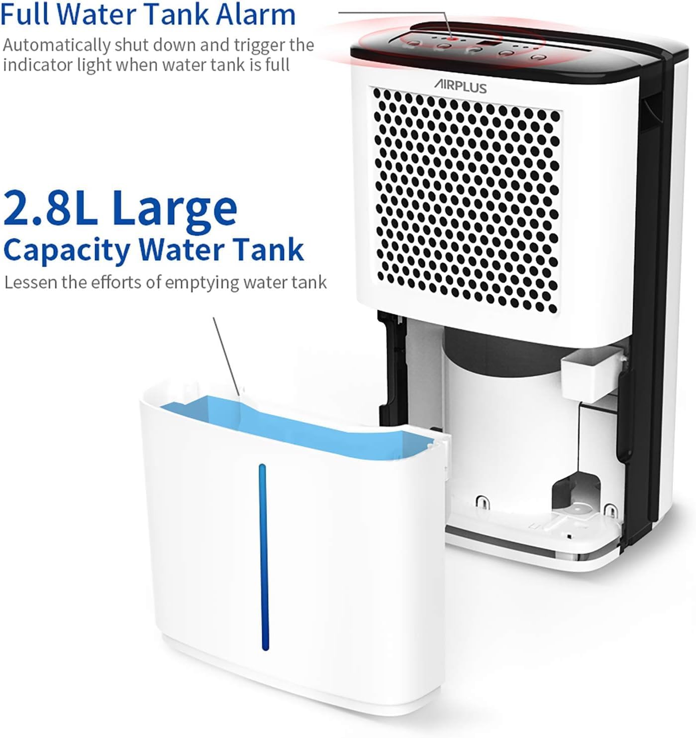 Rendimiento superior y deshumidificación eficiente: Los deshumidificadores AIRPLUS eliminan hasta 70 pintas de humedad al día (con una humedad relativa del 90 % a 30 °C), lo que los convierte en la opción ideal para habitaciones de hasta 420 m². Si busca un deshumidificador para el baño, sin duda será una excelente opción. Drenaje continuo y apagado automático: En comparación con el drenaje manual, conectar una manguera deshumidificadora para drenar continuamente ahorra mucho esfuerzo. Además, si el depósito de agua está lleno, el deshumidificador para dormitorio se detendrá automáticamente, lo cual resulta muy práctico.