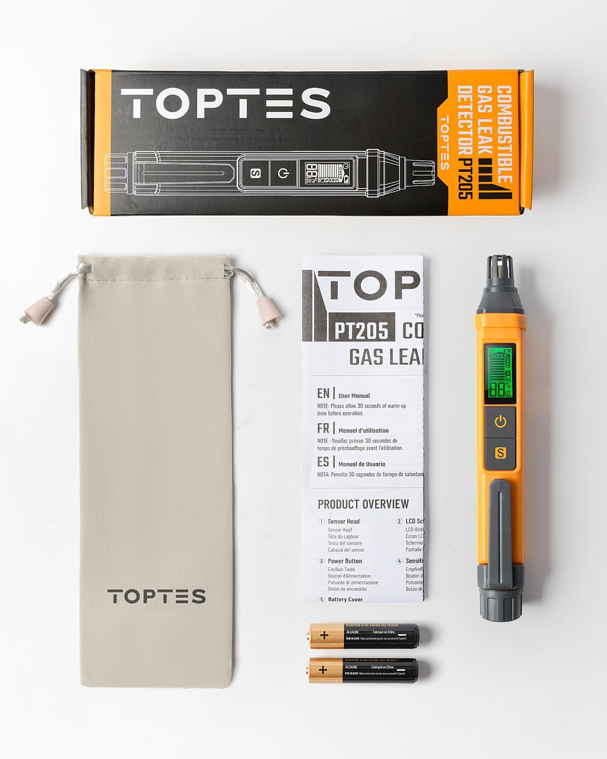 - Detector de fugas de gas combustible: el TopTes PT205 es un detector de fugas de gas mejorado diseñado para garantizar la seguridad de tu hogar y tus seres queridos. El sniffer de gas PT205 es compatible con una amplia gama de gases combustibles, incluyendo GLP, metano, etano, propano, butano, gas natural, gas de carbón, combustible de gas y gas natural licuado. Espere 30 segundos para calentar antes de usar