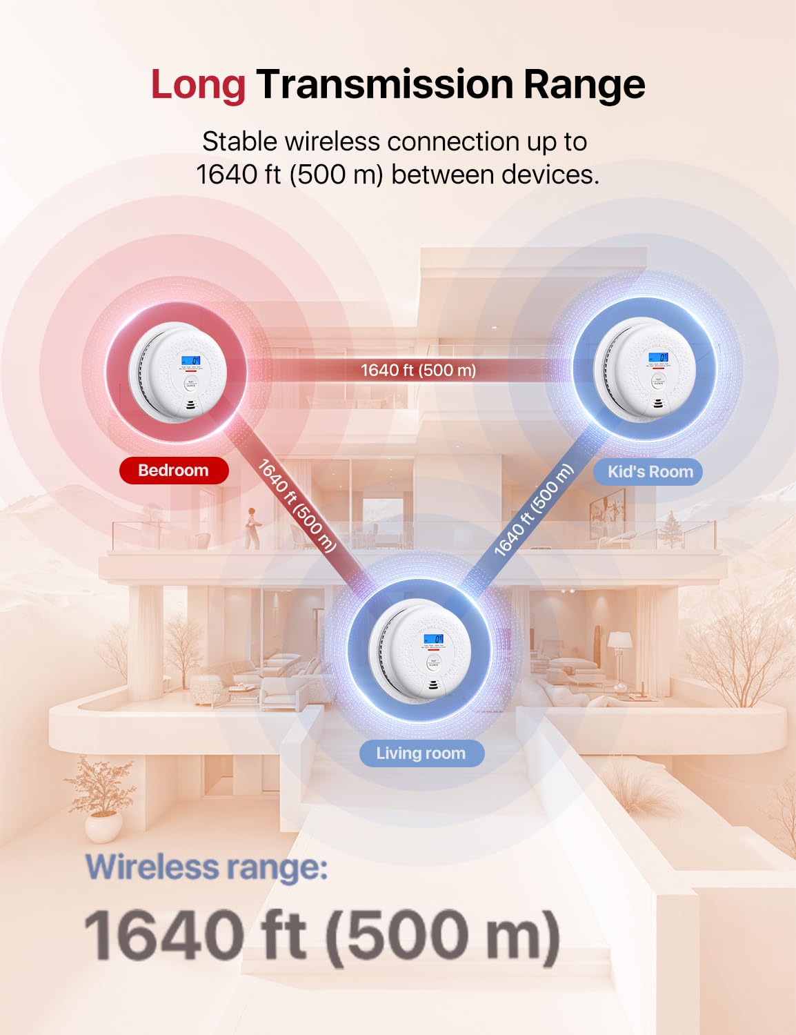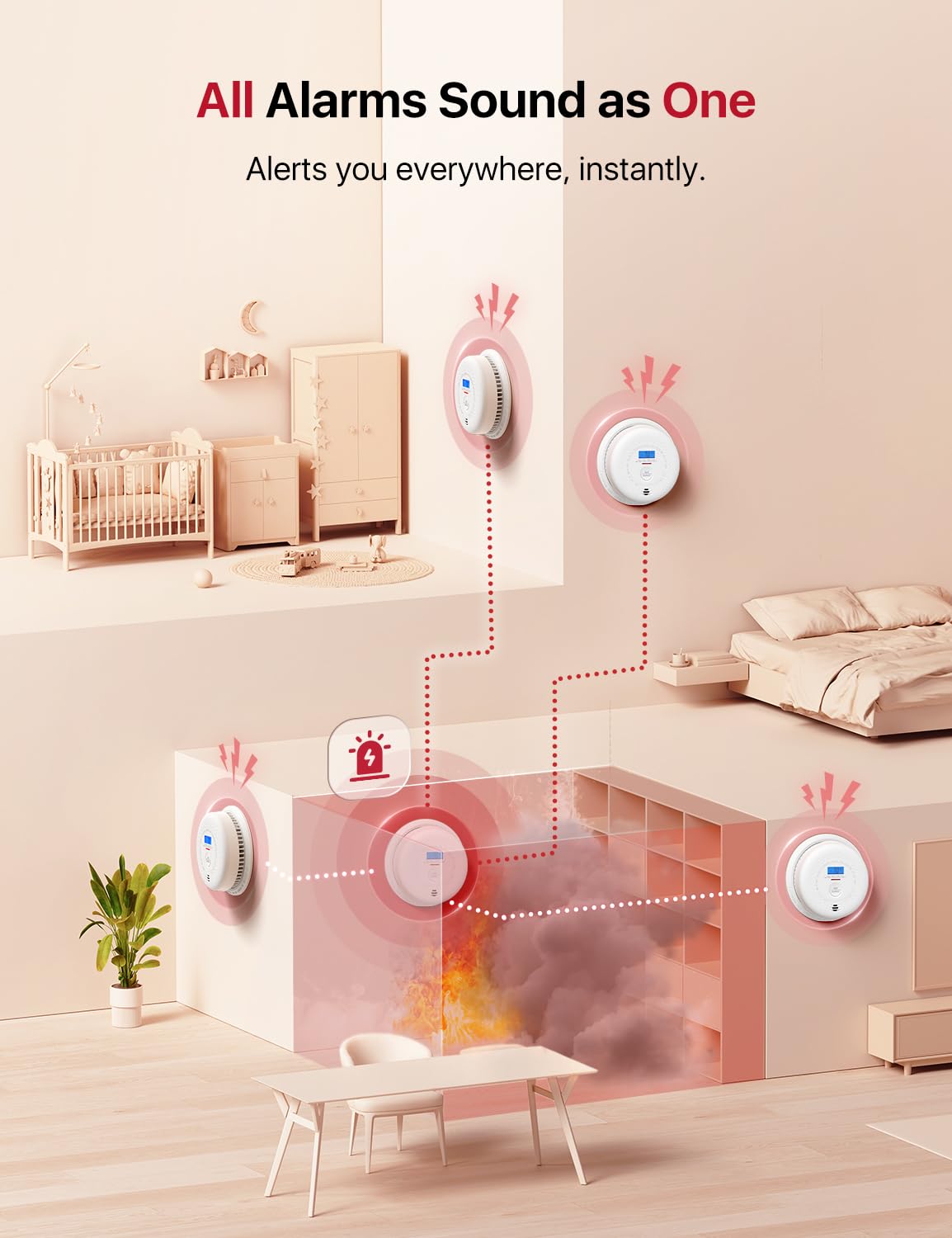 - Interconexión inalámbrica: si una alarma detecta una amenaza, todas las alarmas interconectadas se activarán para hacer sonar una advertencia.