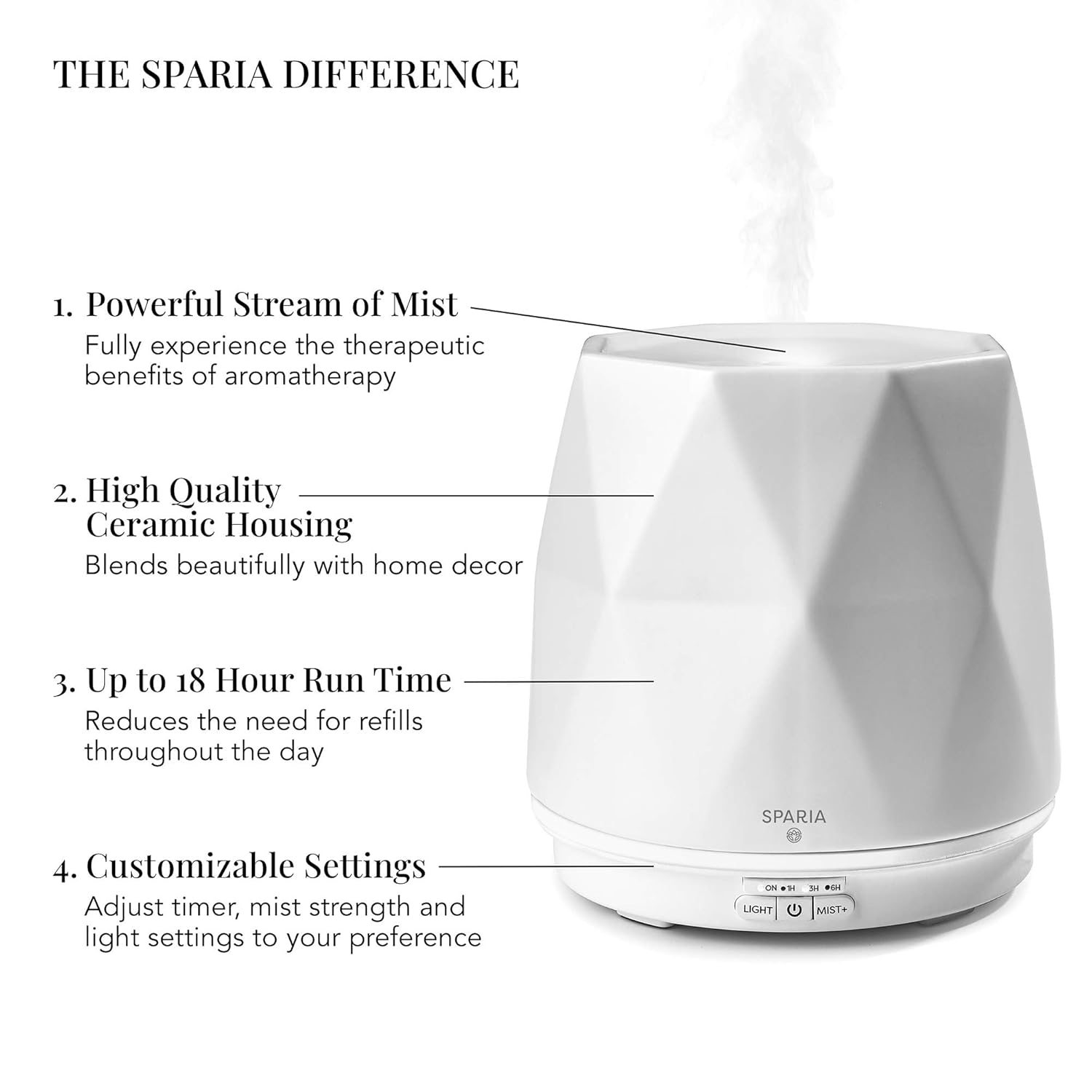 - SPARIA CALMA Y CLARIDAD: Estamos comprometidos a ayudarte a experimentar los beneficios terapéuticos de la aromaterapia para sentirte relajado y tranquilo y transformar holísticamente tu espacio con nuestra línea de difusores y aceites esenciales orgánicos puros.