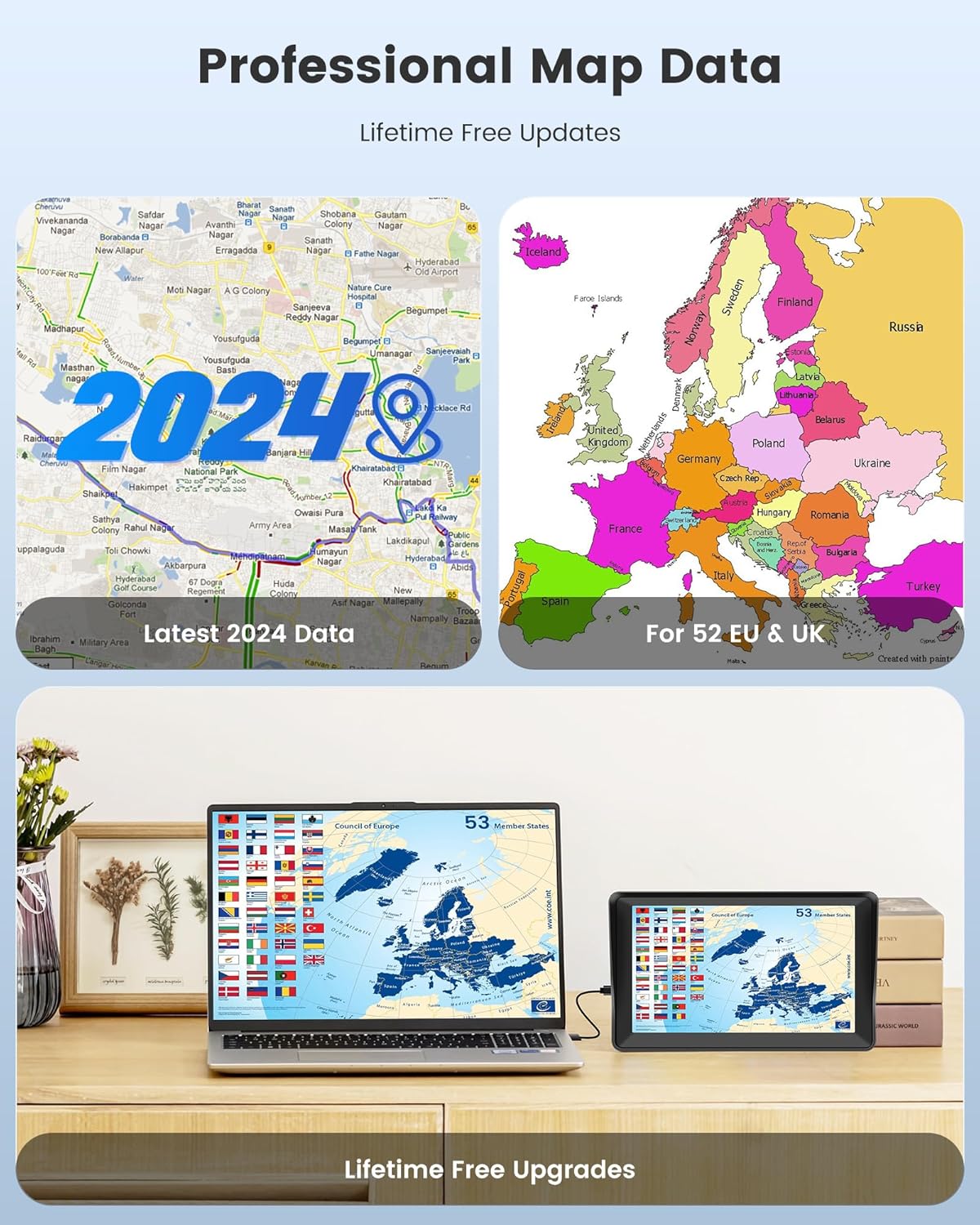- Servicio de mapas sin conexión gratuito de por vida: Receptor GPS incorporado y mapas sin conexión preinstalados de 52 países europeos, admite la navegación en todos los rincones de Europa sin preocuparse por la cobertura de la red, al tiempo que admite la vista 2D/3D y el cambio entre diferentes unidades.