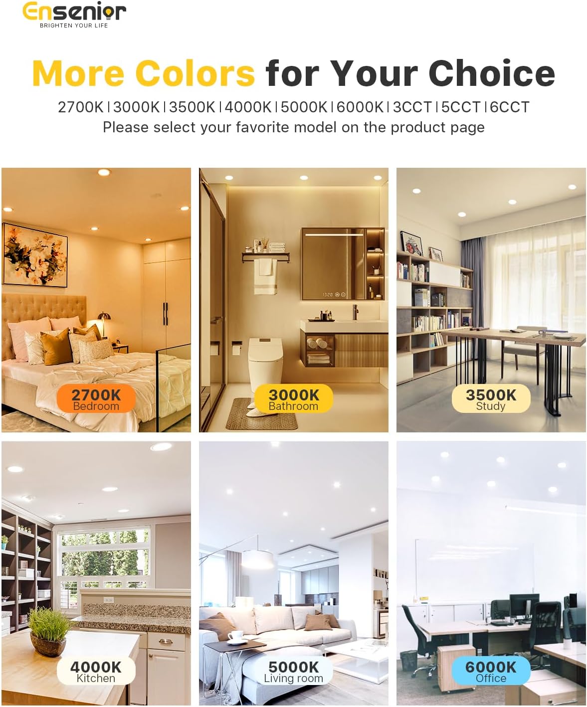 - 5CCT en uno: elige entre 2700K, 3000K, 3500K, 4000K, 5000K con un simple clic en el lateral de la caja de conexión, la luz empotrada sin lata de 6 pulgadas de Ensenior proporciona una iluminación perfecta para tu dormitorio, sala de estar, cocina, baño, oficina en casa y otras habitaciones.
