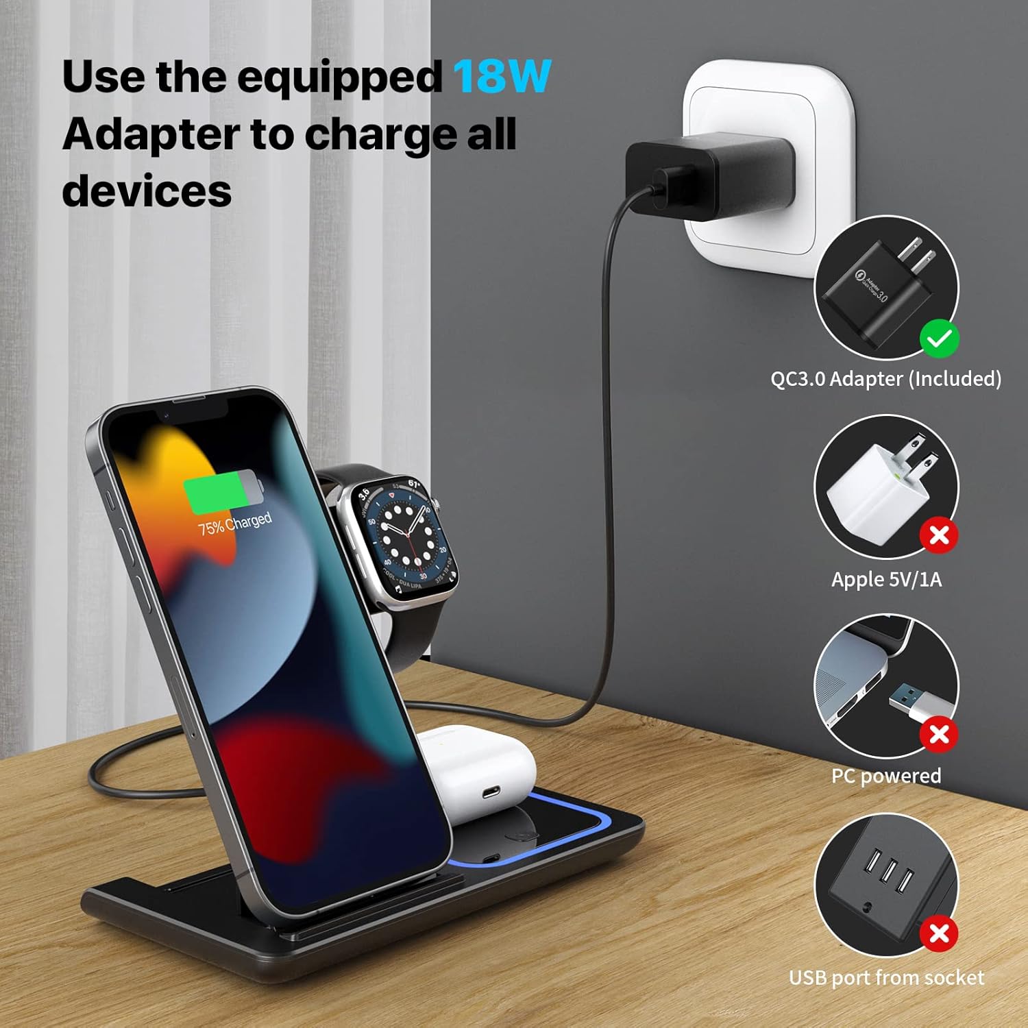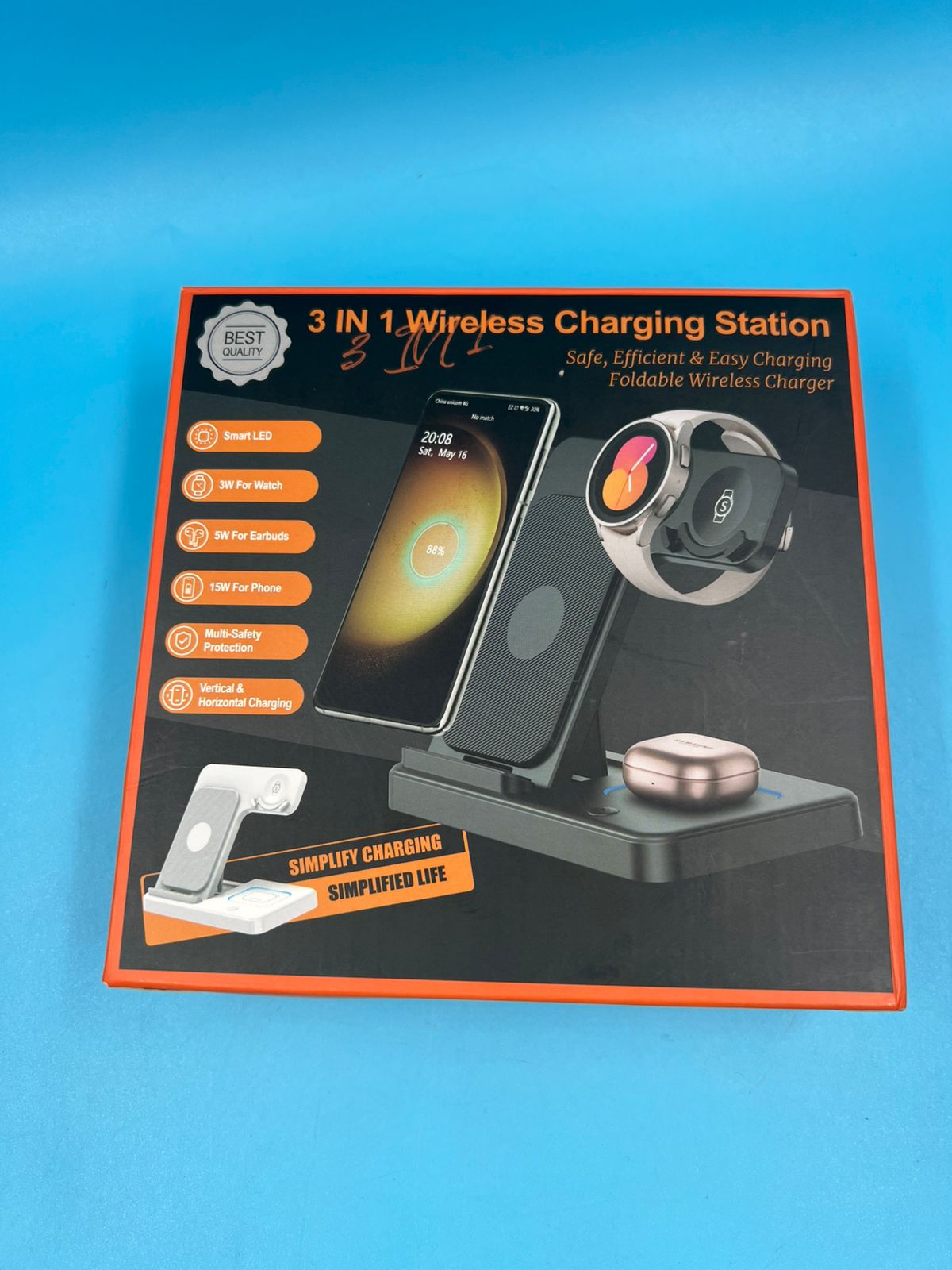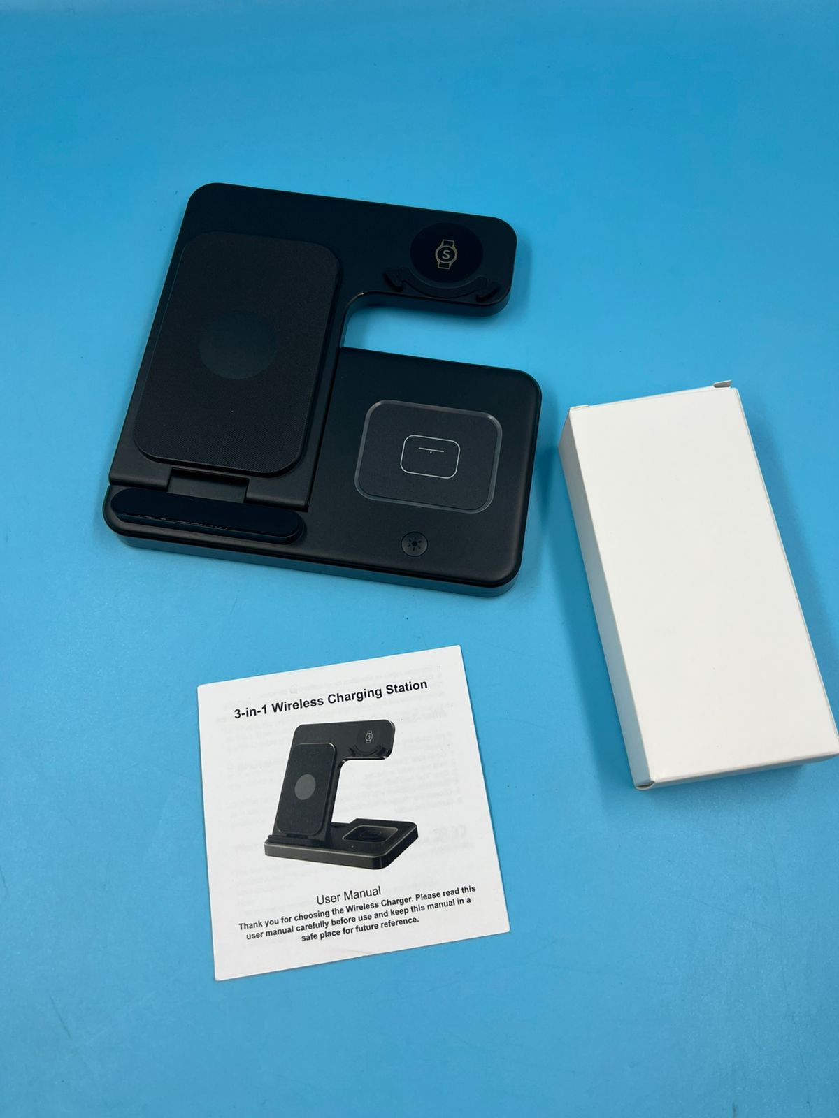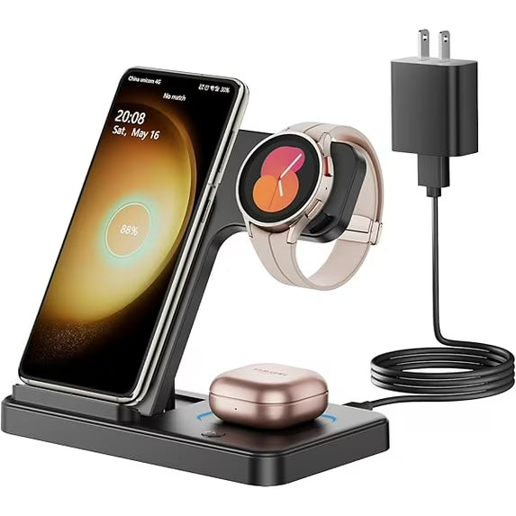 - Carga tres dispositivos simultáneamente con esta estación inalámbrica compacta y versátil. Su diseño plegable la hace perfecta para llevar en viajes o guardar en espacios reducidos. Con potencia de 15W, ofrece carga rápida y eficiente para tu iPhone, Apple Watch y AirPods en un solo lugar. Compatible con la mayoría de dispositivos Qi, elimina el desorden de cables y simplifica tu rutina diaria. Elegante, funcional y práctica, es la solución ideal para mantener todos tus gadgets listos cuando los necesites.