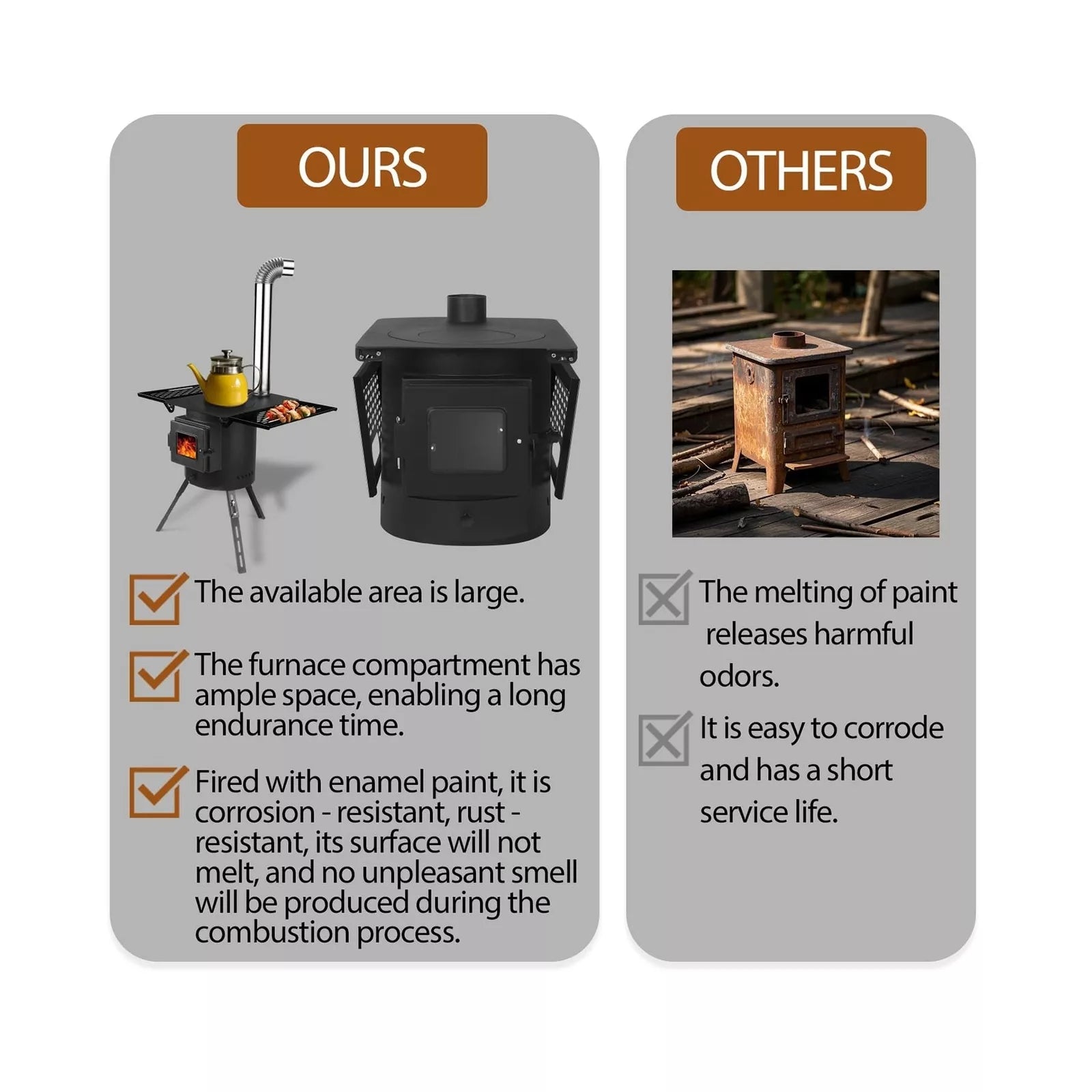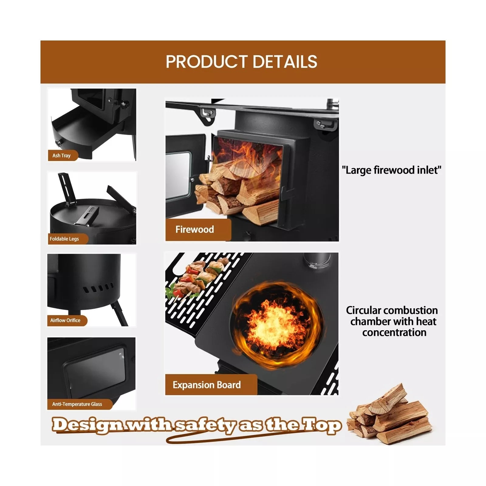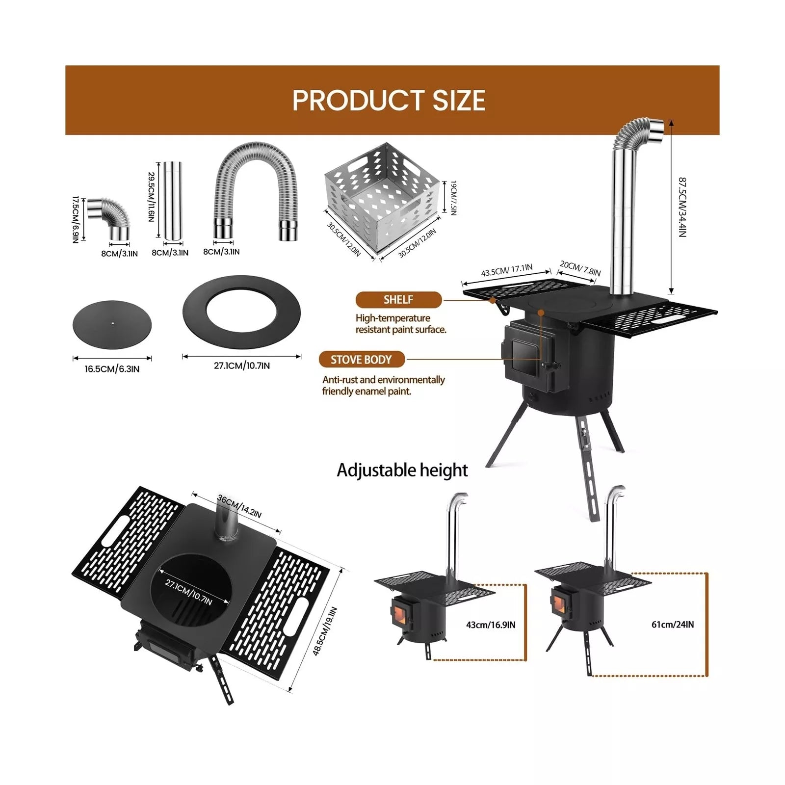 - El diseño de accesorios completos de la pequeña estufa de leña para exteriores e interiores es fácil de usar y completamente funcional, y puede soportar cualquier entorno exterior hostil.
