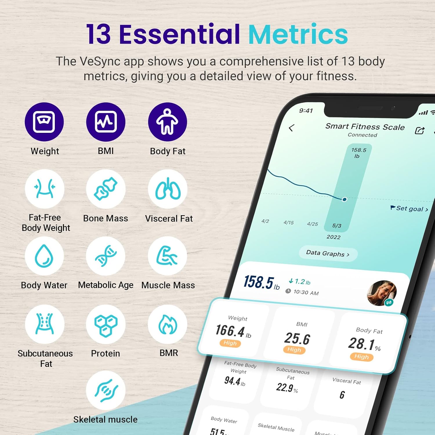 - Análisis completos: Obtenga una visión general de su salud en VeSync con 12 medidas de composición corporal: peso, grasa corporal, agua corporal, masa muscular, masa ósea, proteína, BMR, edad metabólica, grasa visceral, grasa subcutánea, peso corporal sin grasa e IMC