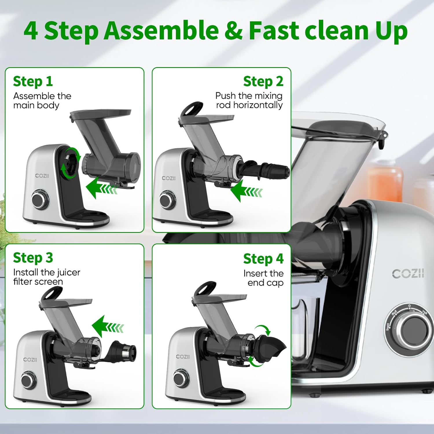 - Diseño fácil de limpiar: nuestros exprimidores de prensa en frío cuentan con un cuerpo desmontable y apto para lavaplatos, lo que hace que la limpieza sea muy fácil. Esta máquina exprimidora cuenta con un diseño de bloqueo de seguridad, te ayuda a montar y desmontar fácilmente en minutos. Función inversa para evitar atascarse y te ayuda a limpiar rápidamente.