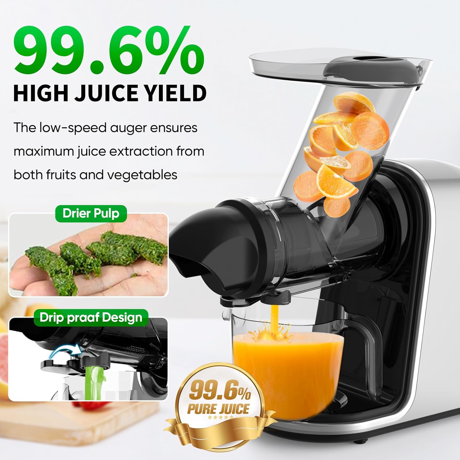 - Alto rendimiento de jugo y nutrición más rica: diseñado para extraer suavemente y a fondo la esencia de frutas, verduras y verduras de hoja. El exprimidor de masticaje lento garantiza que tus bebidas sean ricas en nutrientes y sabor, sin el calor generado por los exprimidores tradicionales. Mejor pelar para obtener el mejor sabor de jugo.