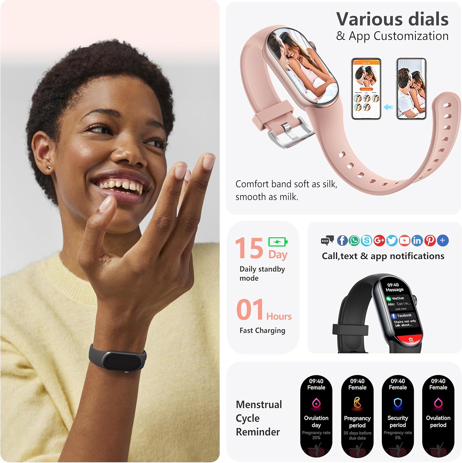 visualización AMOLED HD de 1.6 pulgadas: intensifica tu juego de fitness con el rastreador de fitness FITVII Ole actualizado, con una brillante visualización AMOLED de 1.6 pulgadas. Disfruta de imágenes nítidas y vibrantes y un elegante cuerpo metálico para un aspecto moderno y ligero.