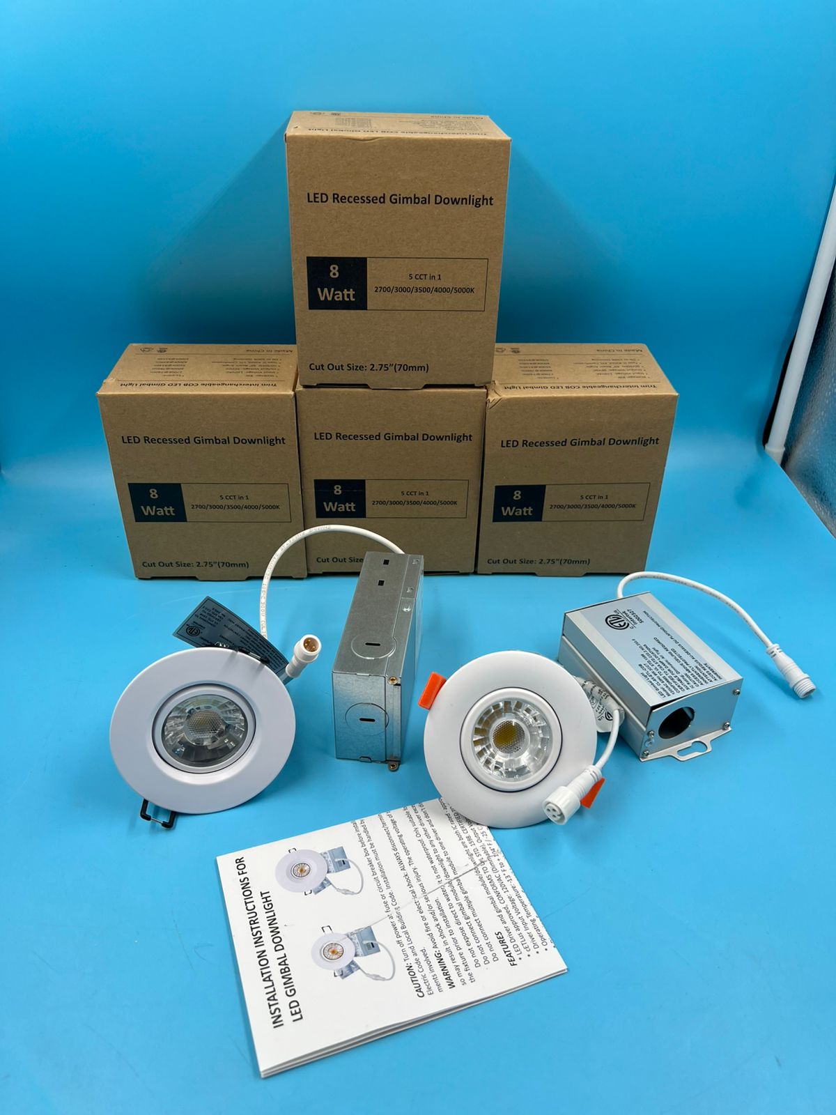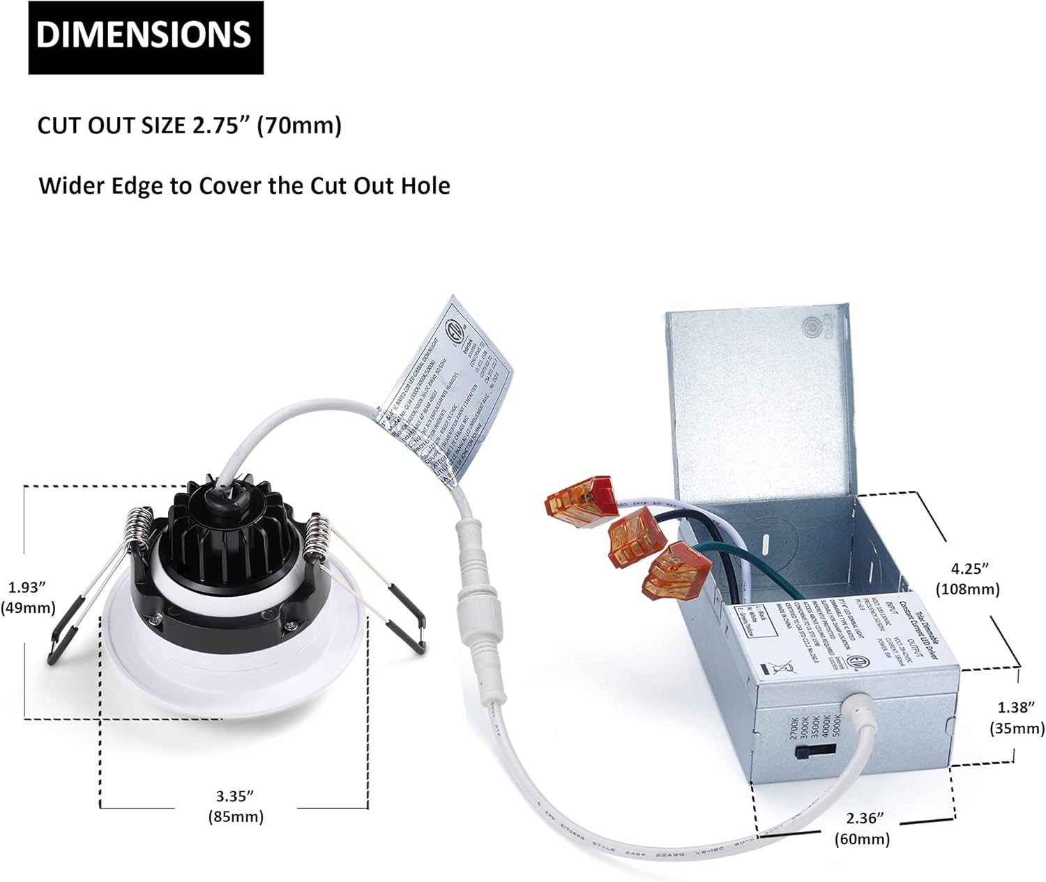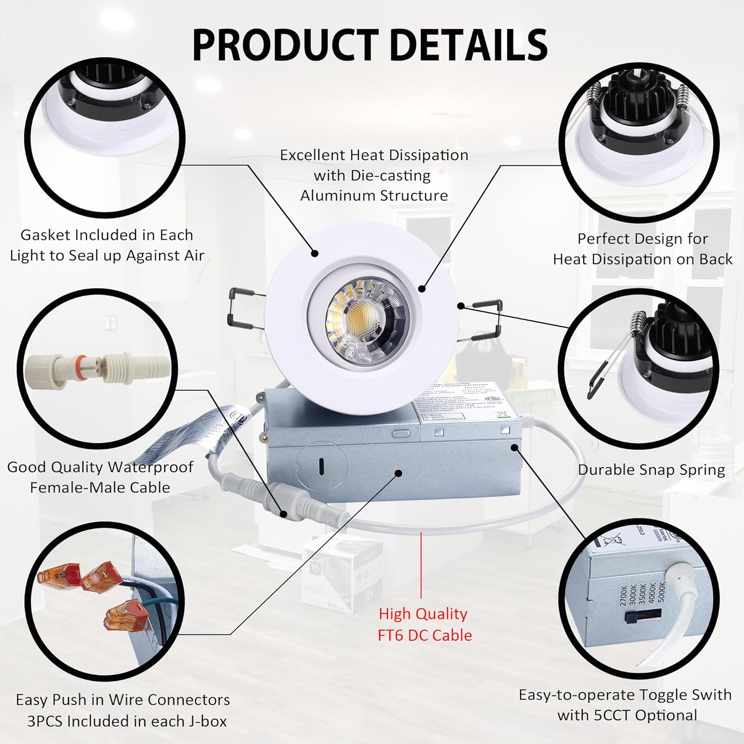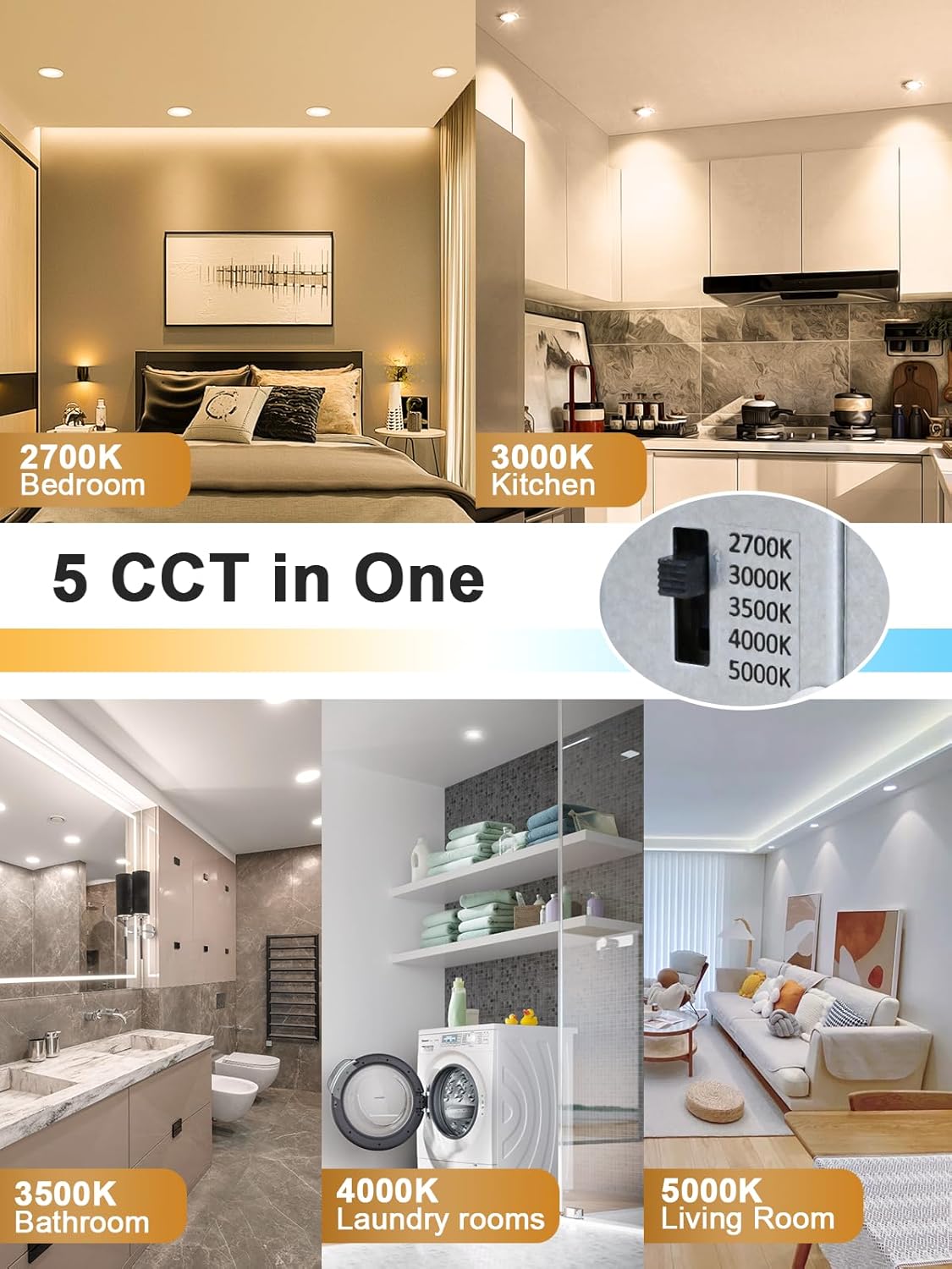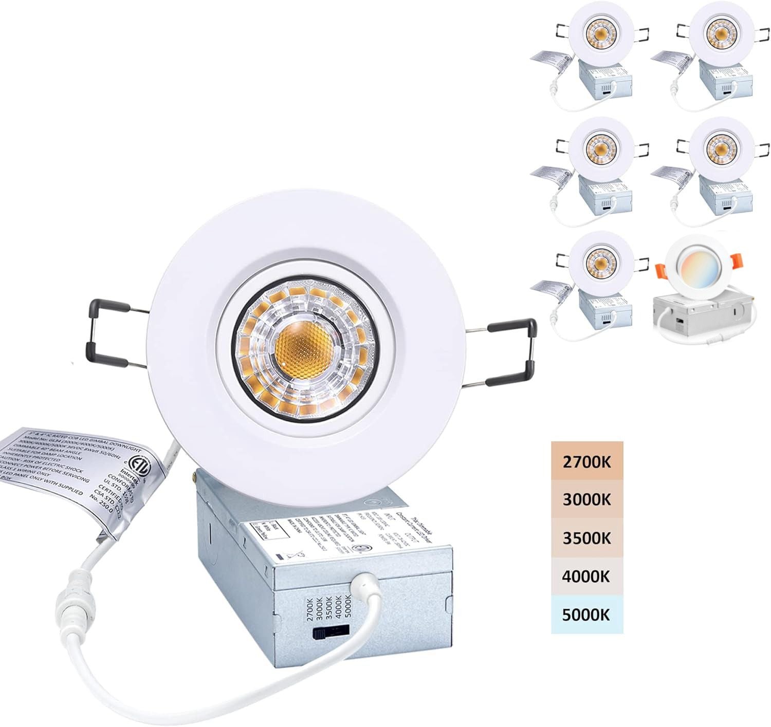 - 5 focos de Cinco CCT en una luz: el downlight cardán empotrado de 3 pulgadas puede satisfacer sus necesidades en 2700/3000/3500/4000/5000K, solo use el interruptor de palanca en la caja de conexiones para elegir el color más deseado que mejor se ajuste a su casa, incluyendo1 foco de 3 CCT en una en 3000k, 4000k y 5000k.