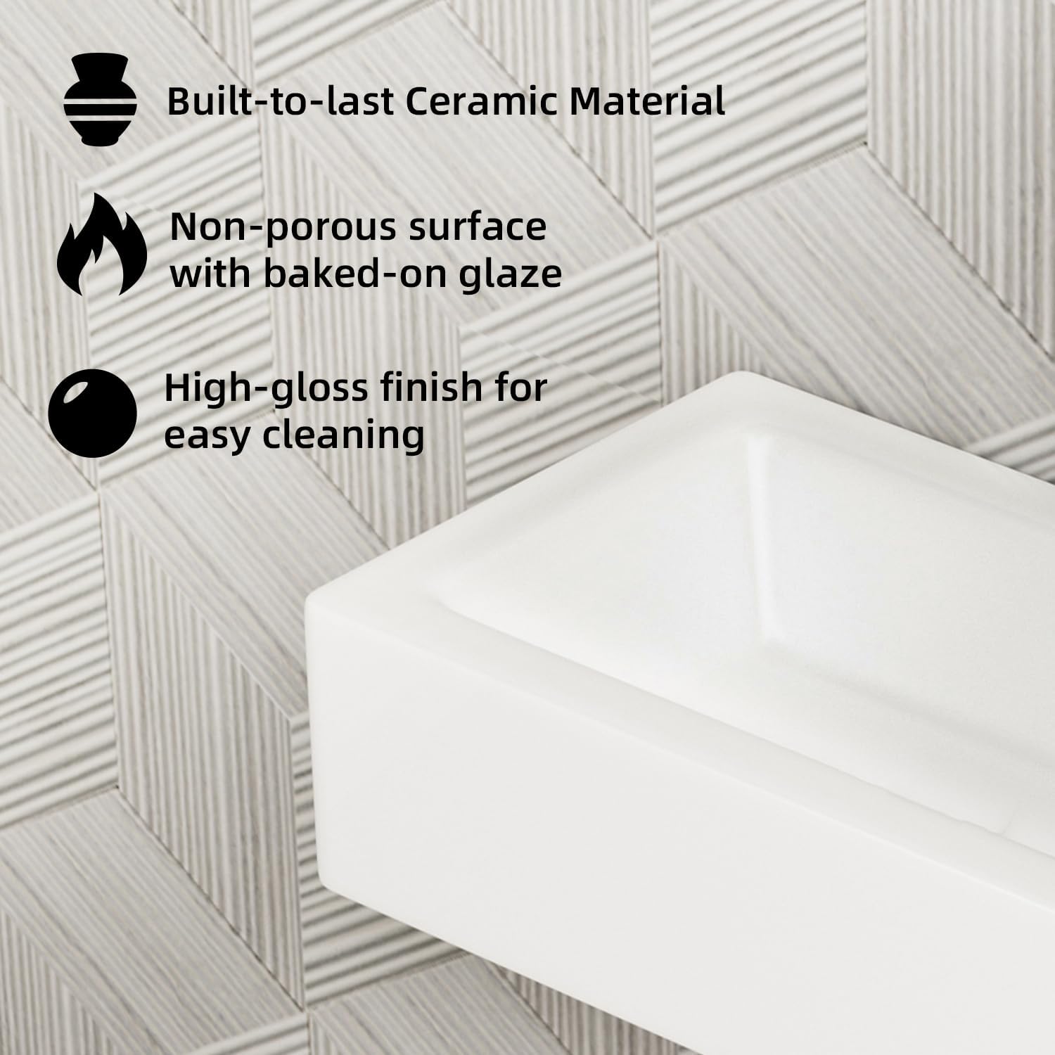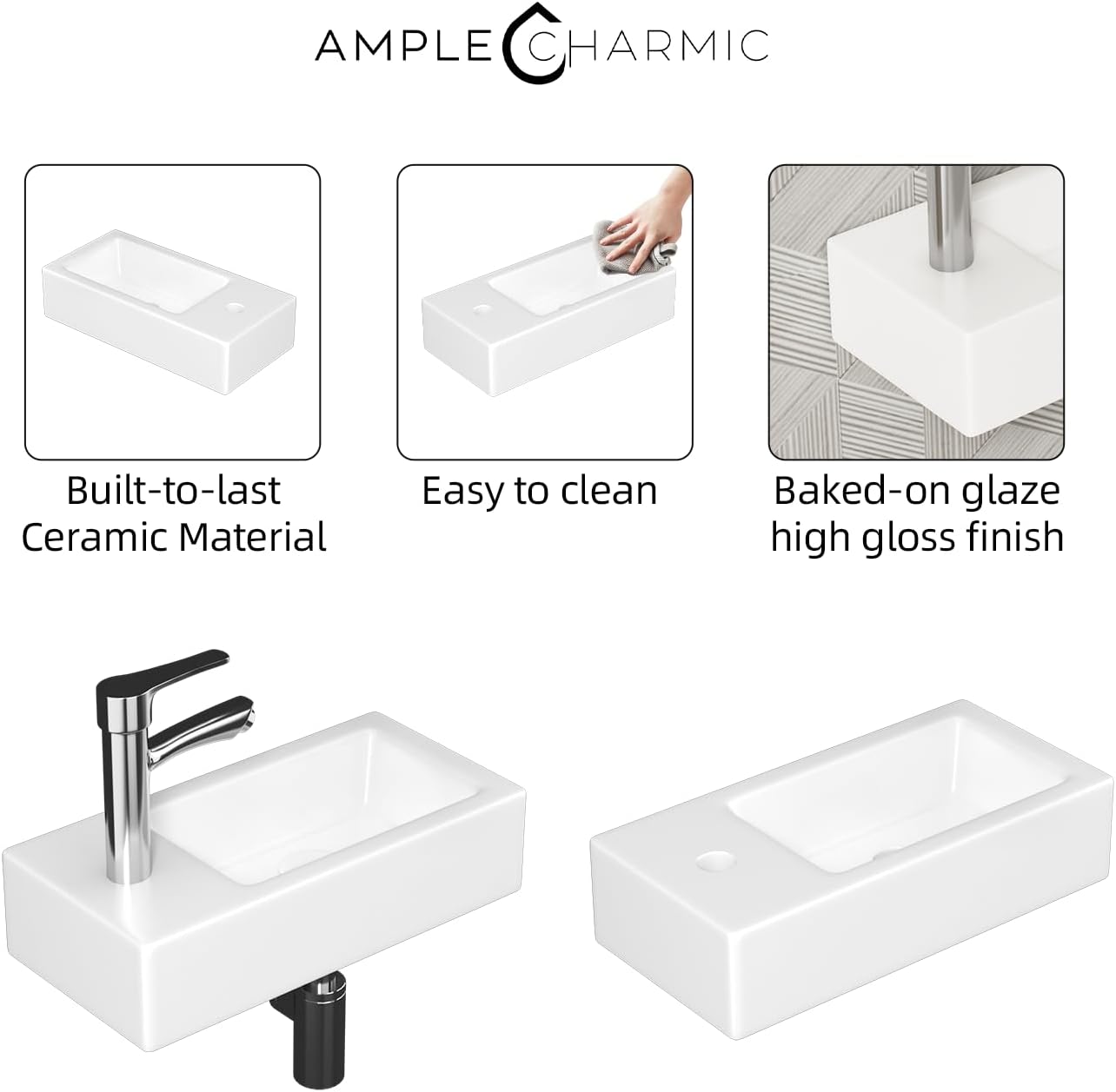 - Construcción de cerámica premium: este lavabo de baño está hecho de material cerámico de primera clase con superficie no porosa y vidrio blanco brillante, propósito construido para durar y fácil de limpiar.