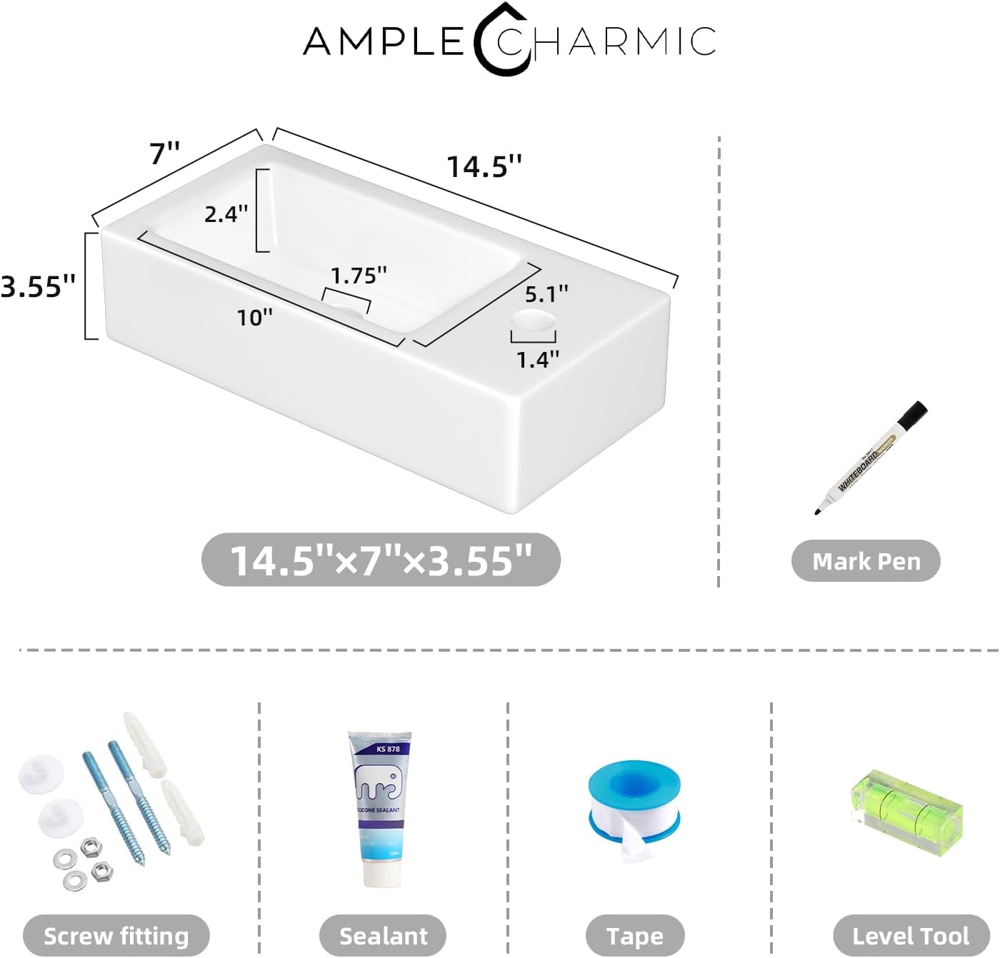 - Dimensiones: 14.5 pulgadas de largo x 7.3 pulgadas de ancho x 3.6 pulgadas de alto, un tamaño adecuado para baños pequeños o coakroom, ahorro de espacio.