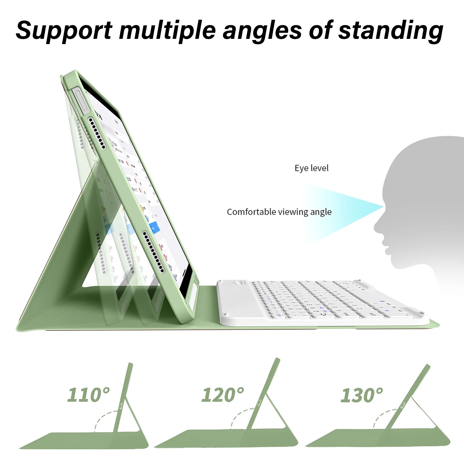 - Batería de larga duración y compatibilidad multiángulo: La batería recargable de polímero de litio integrada, de alta capacidad, permite que el teclado inalámbrico de esta funda para iPad de 11.ª/10.ª generación con teclado dure más de 3 días con 2-3 horas de carga completa. La carcasa protectora se puede inclinar en diferentes ángulos para ajustar el ángulo de visión óptimo, lo que la hace muy flexible y fácil de usar.
