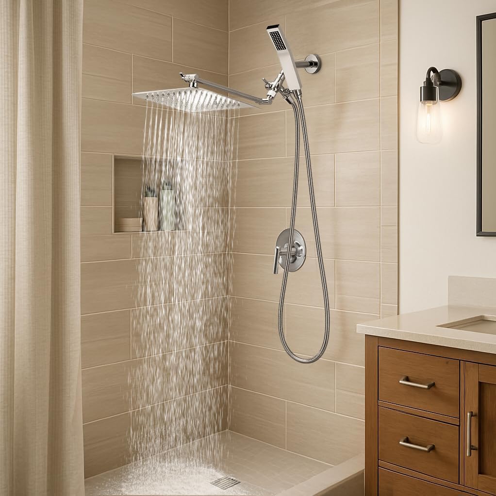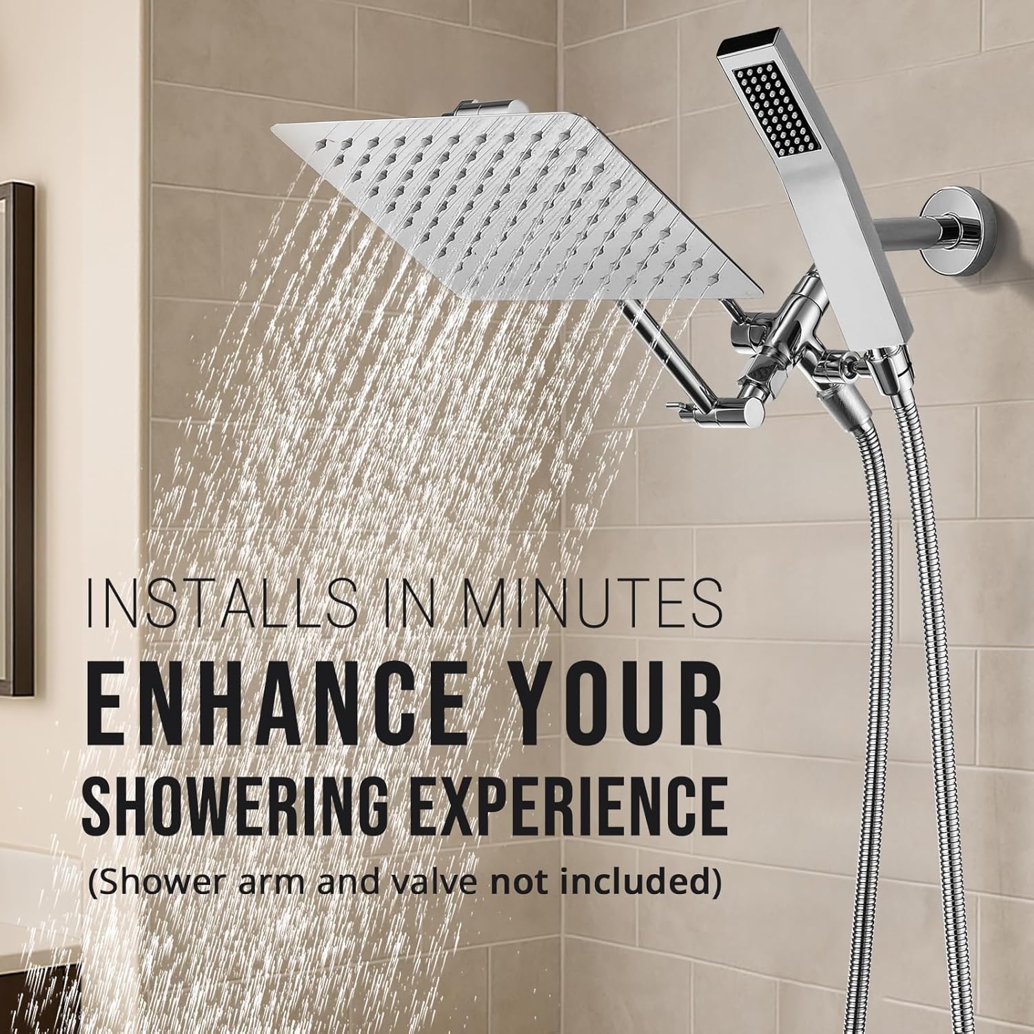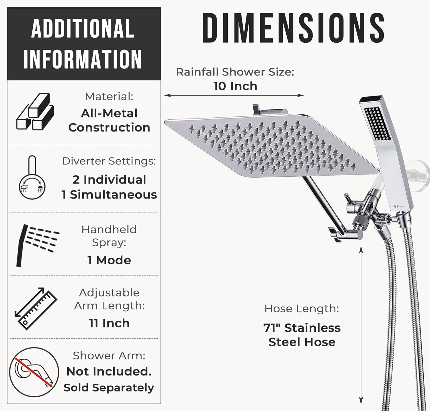 G-Promise Combo de cabezal de ducha cuadrado doble de 10 pulgadas, cabezal de ducha de lluvia, varita de ducha de mano, ajustable, desviador suave de 3 vías, manguera extra larga de 71 pulgadas.