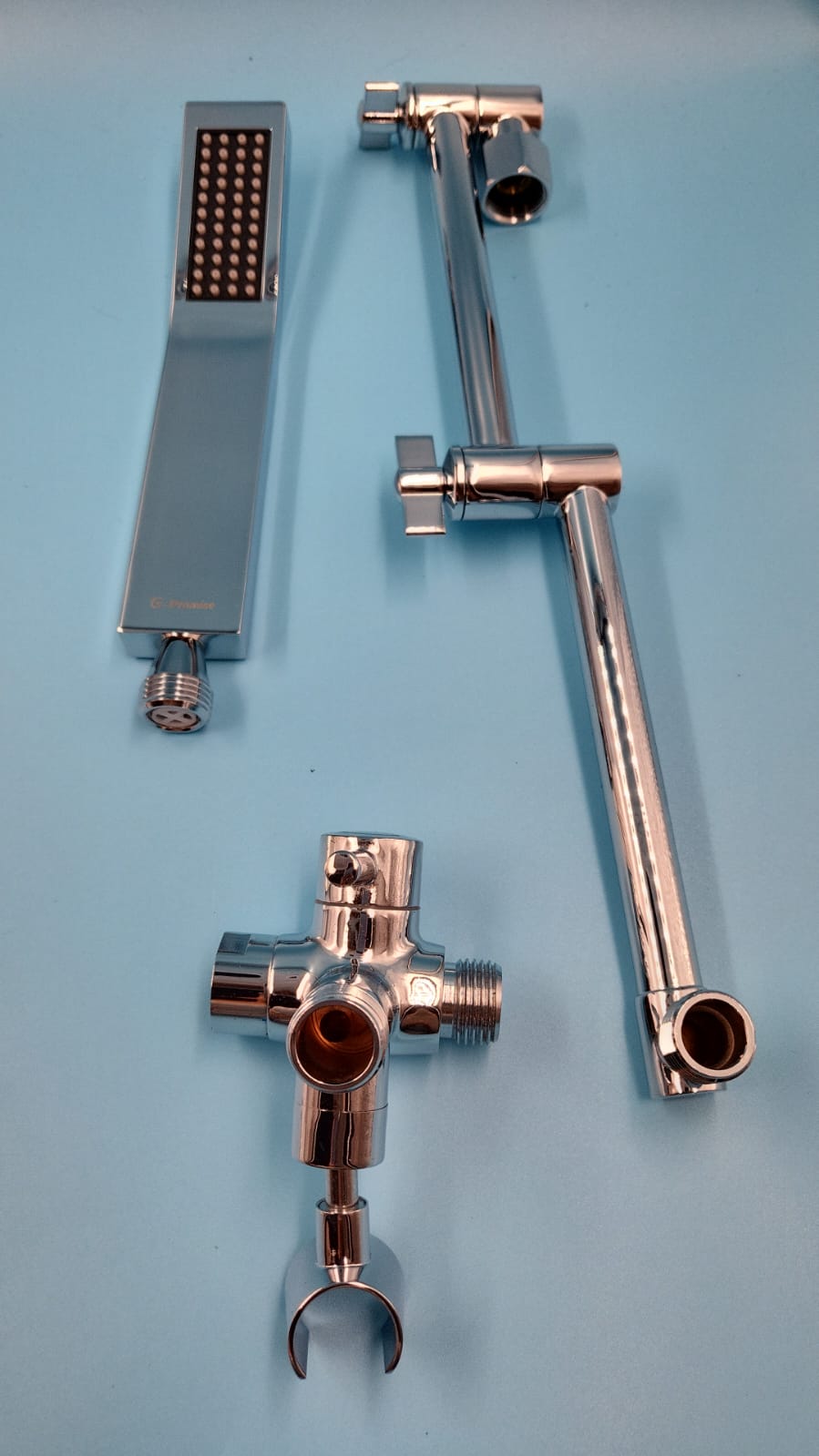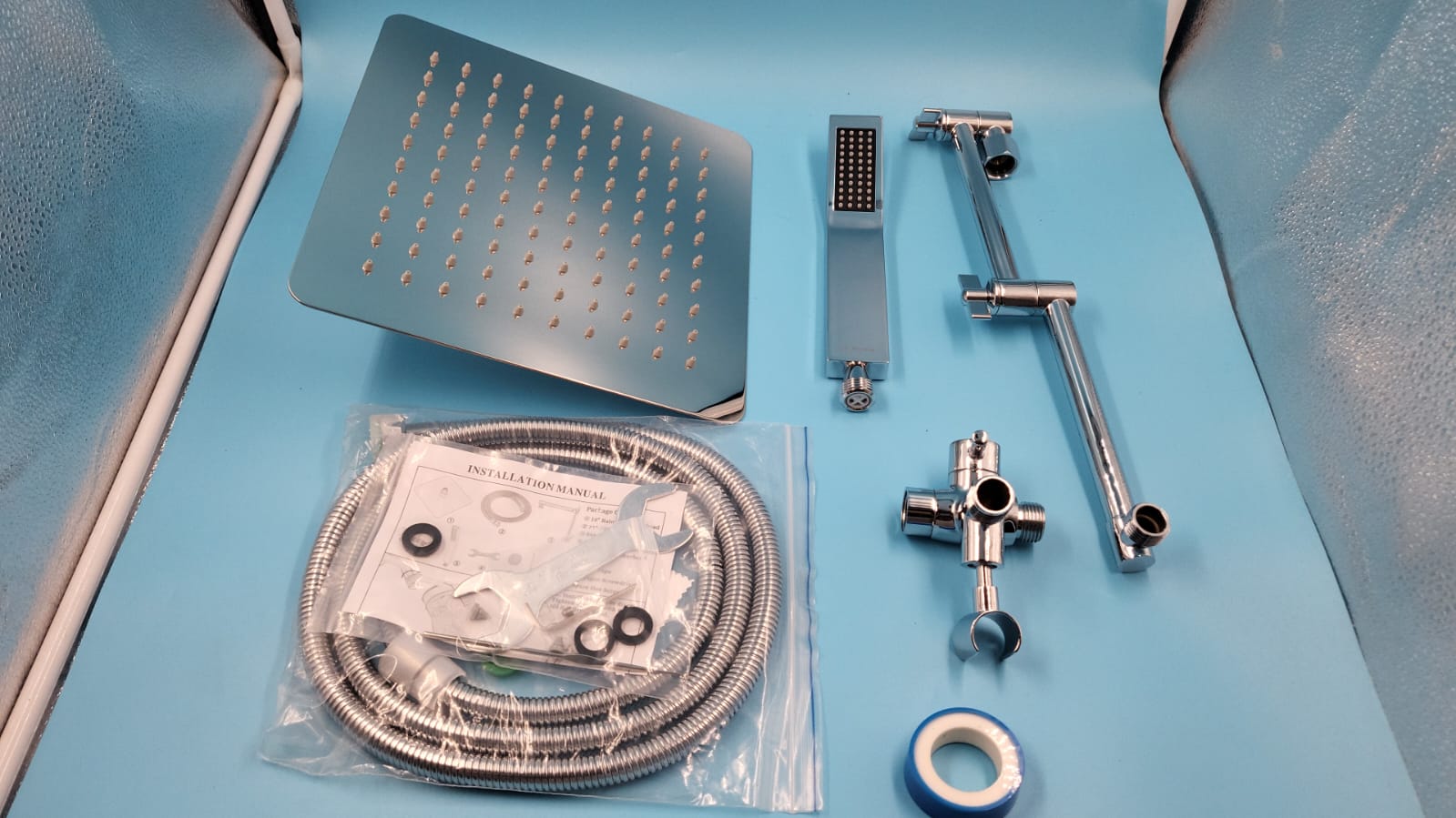 l paquete incluye: cabezal de ducha tipo lluvia, cabezal de ducha de mano, brazo de extensión de ducha, manguera de ducha, desviador de ducha y accesorios.