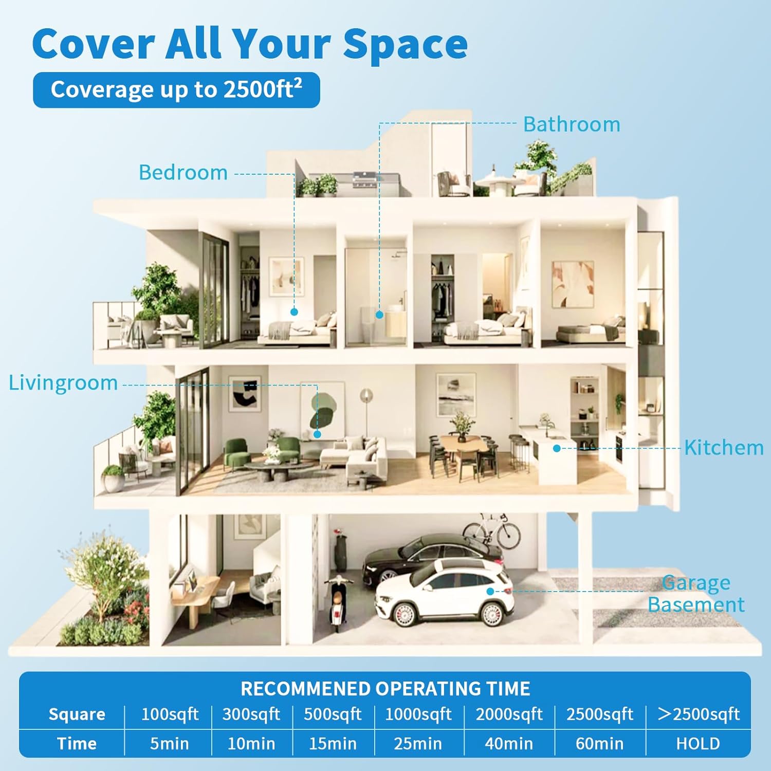 - ¡Dual Magic Unleashed! Este generador cuenta con un exclusivo sistema de ozono y iones negativos 2 en 1. Un verdadero cambio de juego para una mejor desodorización y purificación del aire. Despídete de los olores persistentes y da la bienvenida a un espacio naturalmente fresco en poco tiempo. Duplica el poder de limpieza para una experiencia verdaderamente notable.