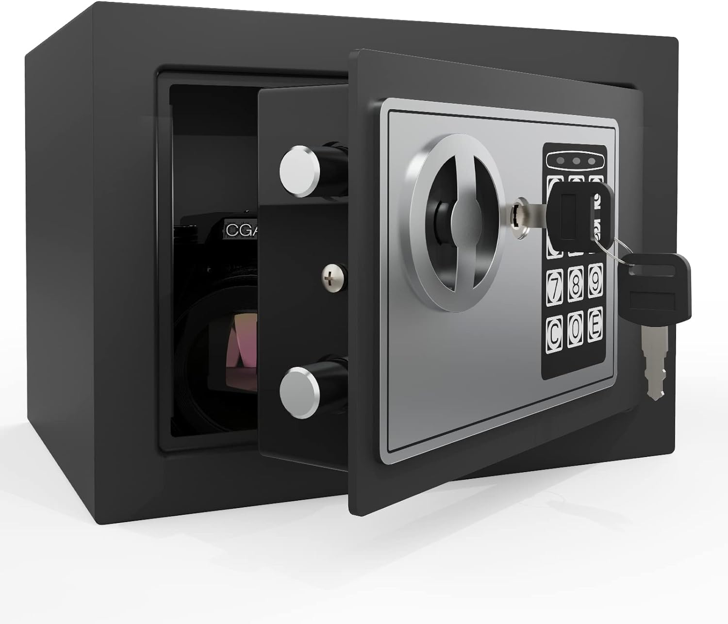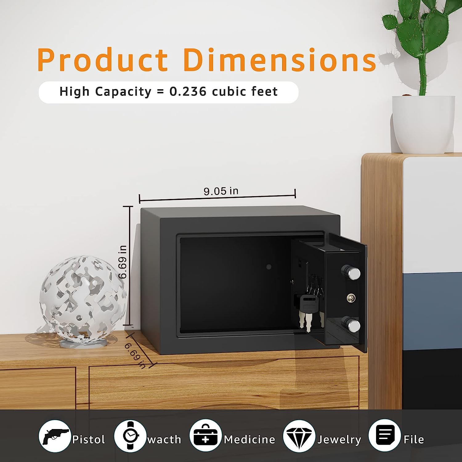 - Compacto y versátil: mide solo 6.7 x 9.0 x 6.7 pulgadas, esta caja fuerte está diseñada para adaptarse perfectamente debajo de un clóset, cajón o mesa. A pesar de su tamaño compacto, ofrece una capacidad de 0.3 pies cúbicos, proporcionando un amplio espacio para almacenar tu dinero, joyas, documentos importantes y otros objetos de valor. Ya sea que necesites un almacenamiento seguro para tu hogar o estés buscando un regalo considerado, esta caja fuerte es la elección perfecta.