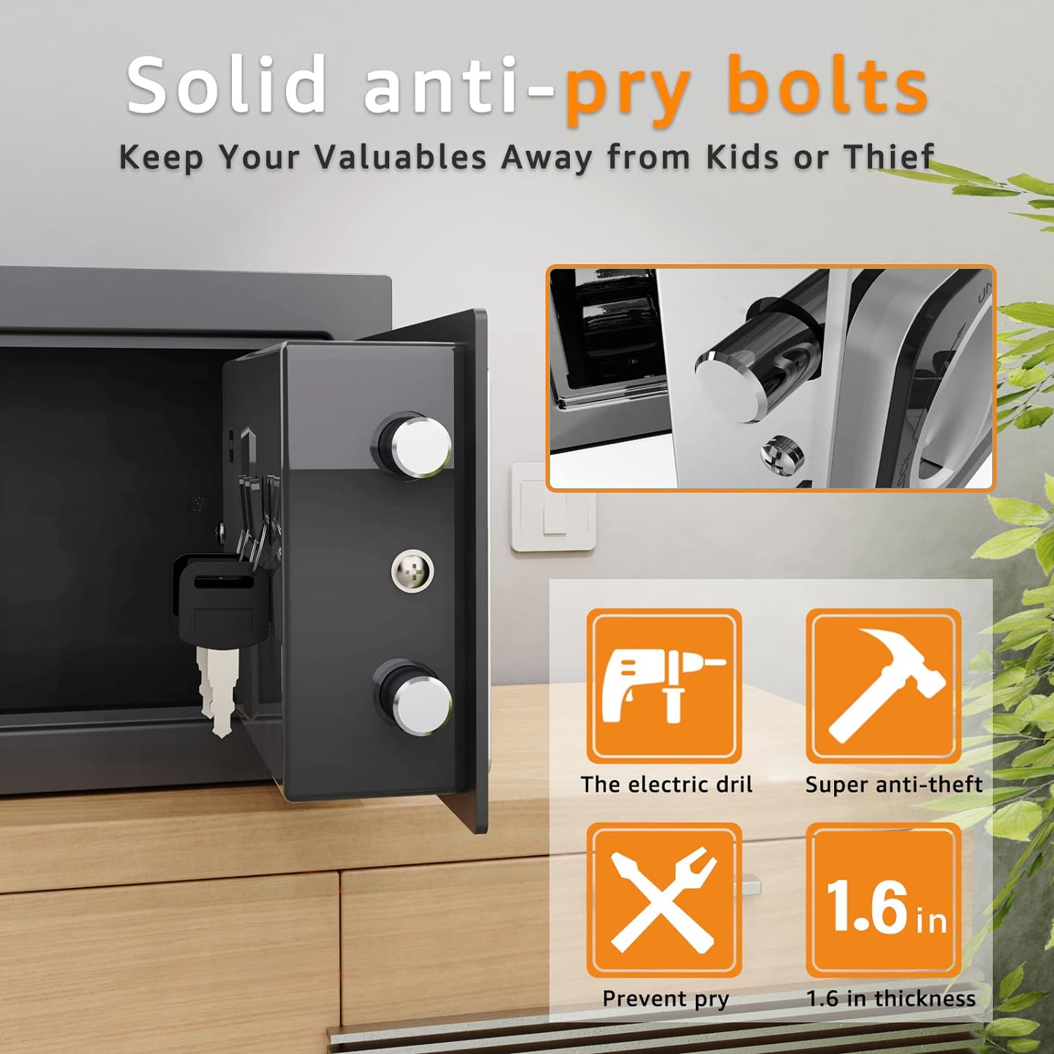 - Características de seguridad mejoradas: construido con acero de aleación reforzada, esta caja fuerte ofrece una durabilidad excepcional. El interior cuenta con una alfombra antiarañazos para proteger tus pertenencias, mientras que las bisagras ocultas resistentes a las palancas mejoran su seguridad. Los pernos de alta resistencia y un revestimiento resistente a la corrosión protegen aún más contra la manipulación. Para mayor tranquilidad, la bolsa impermeable e ignífuga incluida garantiza una doble protección para tus objetos de valor, manteniéndolos a salvo de incidentes inesperados.