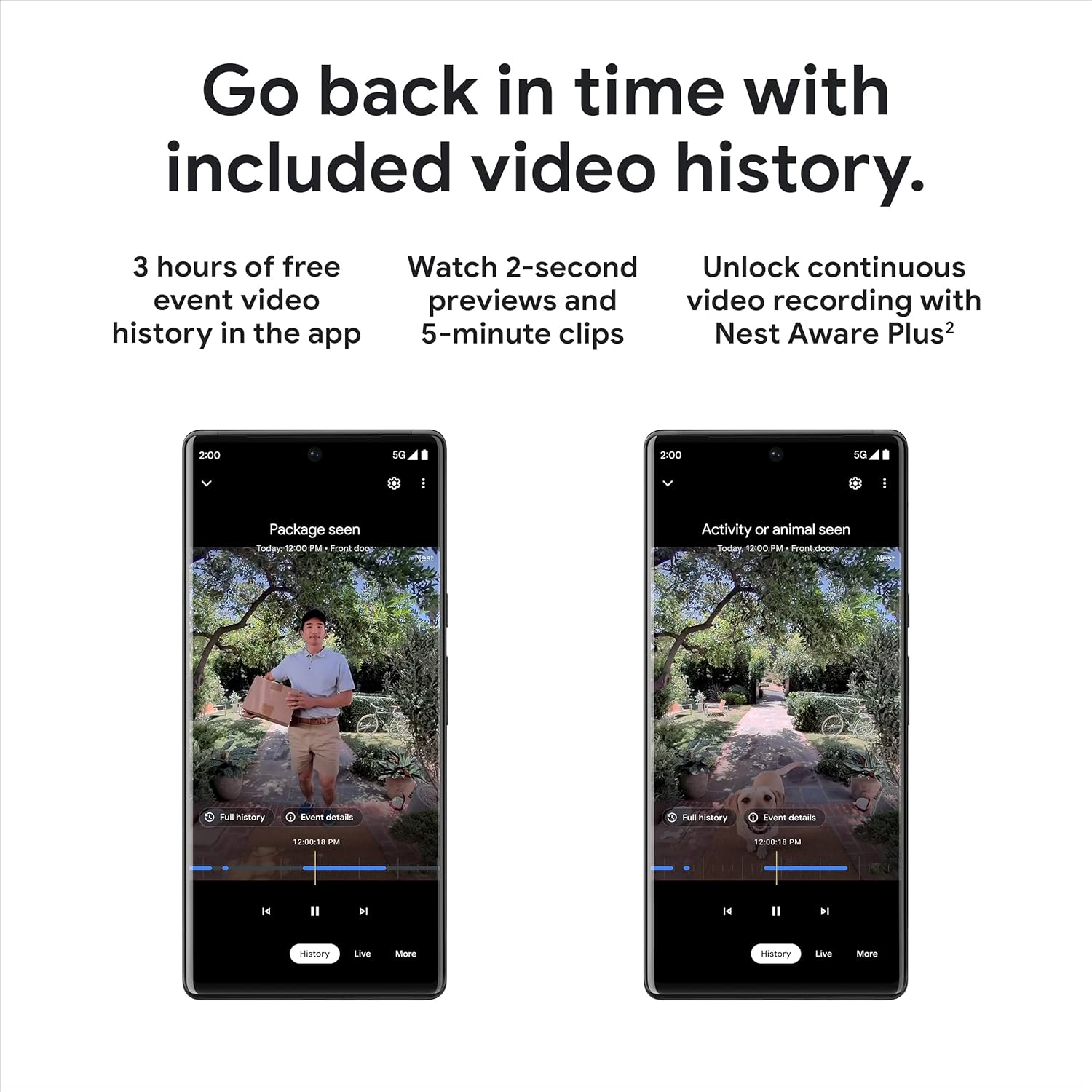 - Mira lo que te perdiste con 3 horas de historial de videos de eventos gratuito incluido en la aplicación Google Home; mira vistas previas de 2 segundos y clips de 5 minutos de actividad importante.