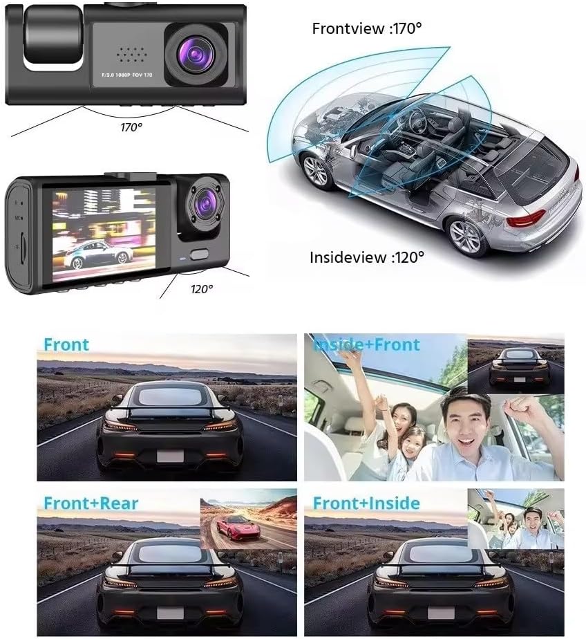 - Cámara de salpicadero 1080P delantera y trasera interior con visualización HD: Los videos de 3 canales se muestran en la visualización IPS que te dan retroalimentación de video en tiempo real de 3 lados de tu coche.