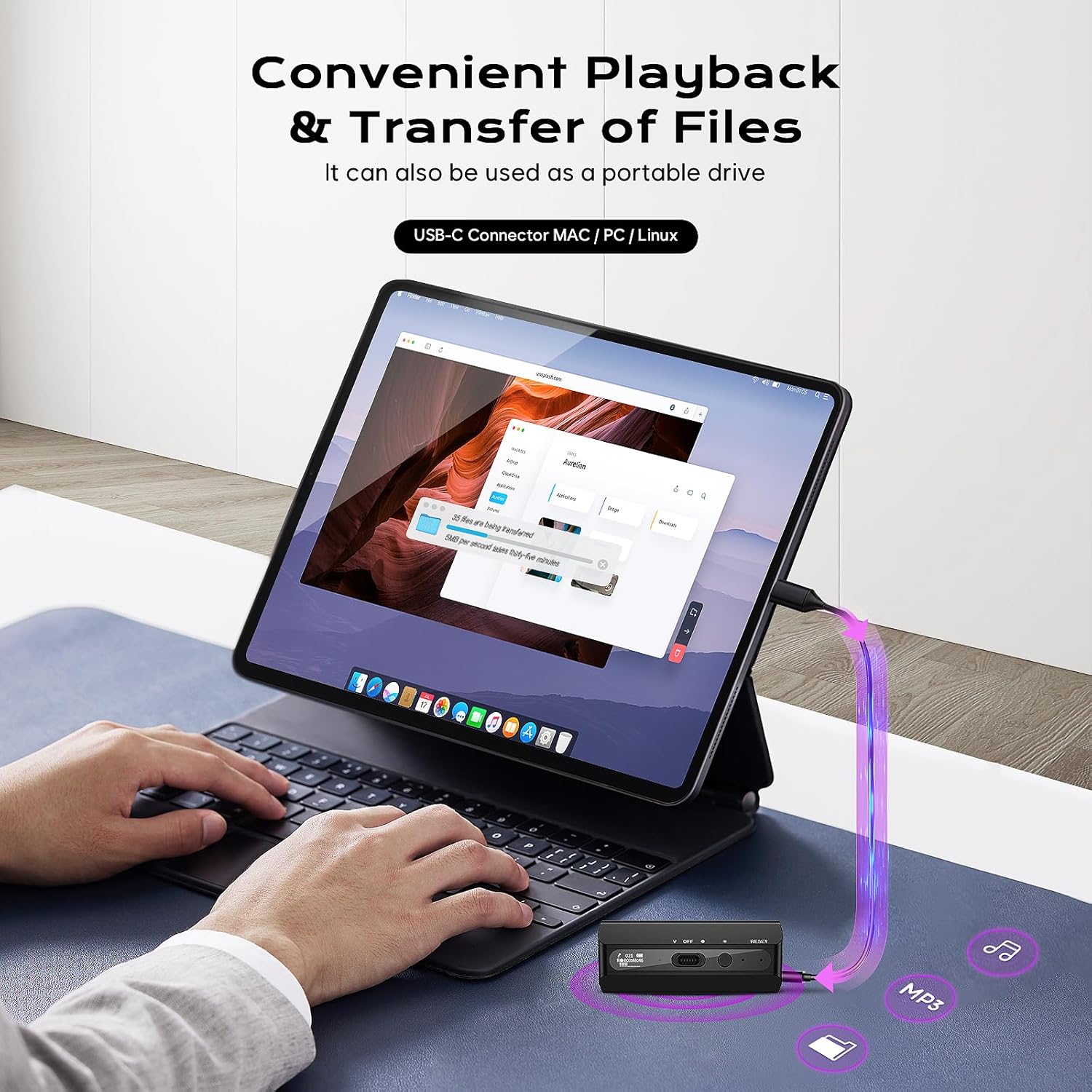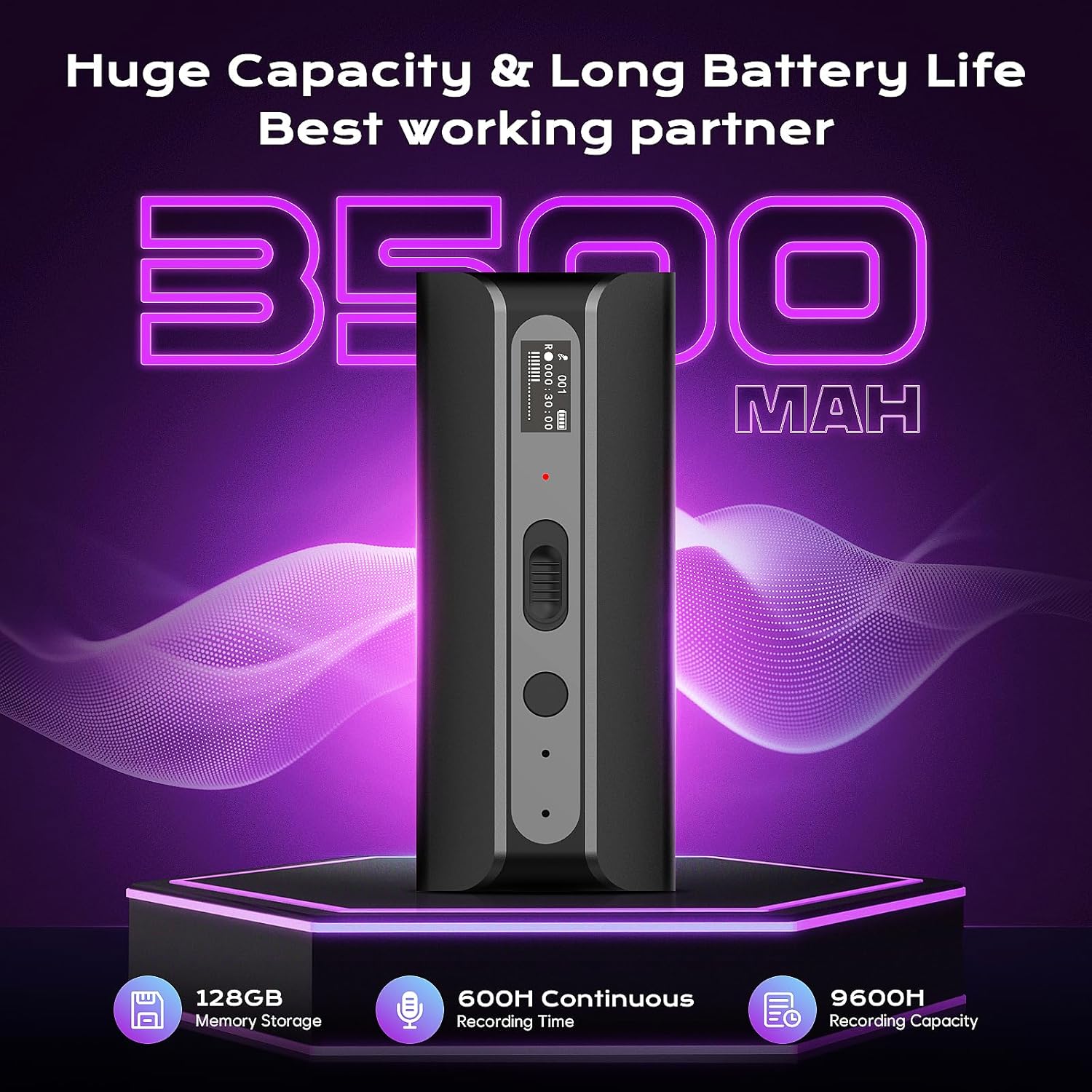 - 128 GB de memoria masiva, 9800 horas de memoria de audio: Con una impresionante memoria de 128 GB, la grabadora de voz magnética ofrece una enorme capacidad para almacenar hasta 9800 horas de archivos de audio (a 32 kbps). Una herramienta perfecta para el almacenamiento fiable de archivos de audio de hasta un año, lo que lo convierte en una excelente opción para profesionales, estudiantes, periodistas y cualquier persona que necesite grabar y guardar conferencias, reuniones y entrevistas.