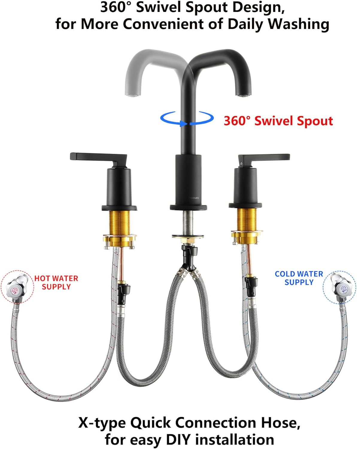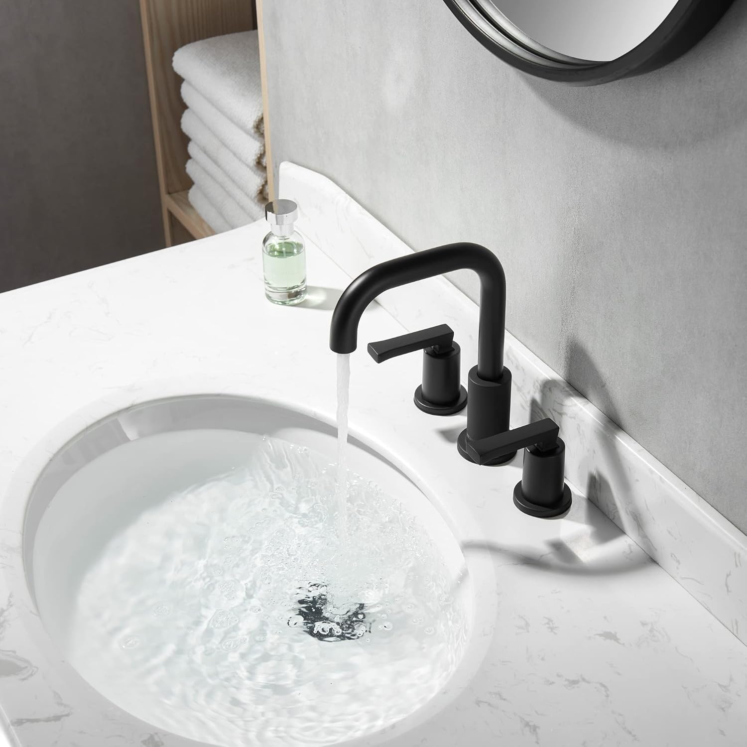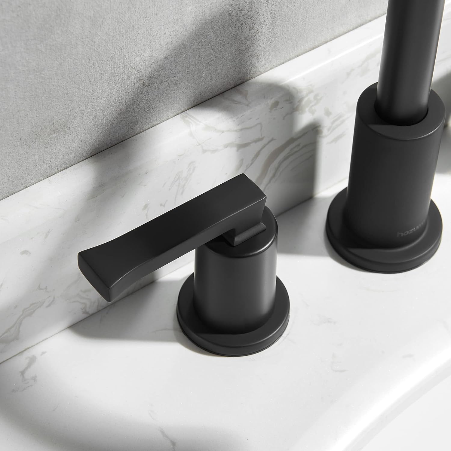 Grifo de baño negro mate de 8 pulgadas de ancho, moderno grifo de baño de dos manijas con desagüe emergente y 2 líneas de suministro de agua, grifos para lavabo de tocador de baño, para juego de 3 orificios de 8 pulgadas de ancho.