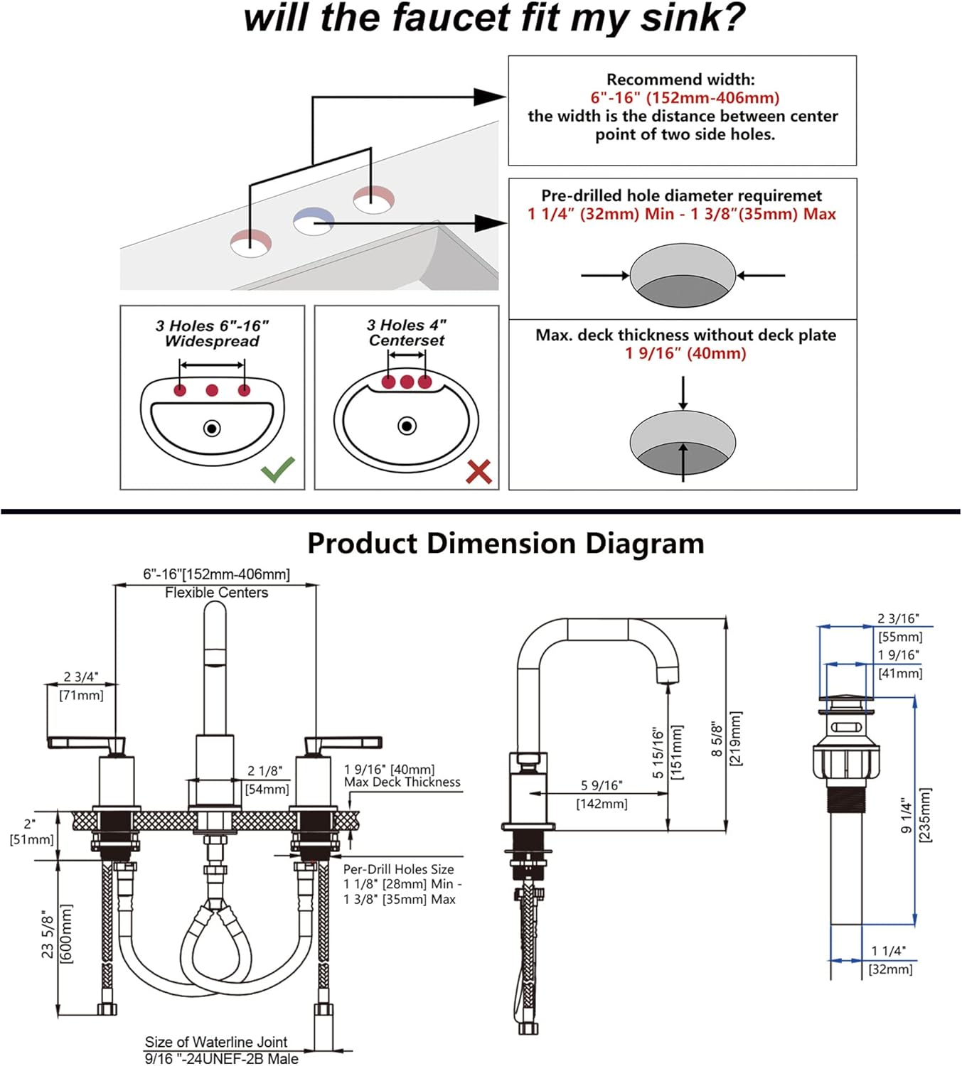 - FÁCIL INSTALACIÓN DE BRICOLAJE, diseñada para adaptarse a configuraciones generalizadas de 3 orificios, las manijas se pueden instalar entre 6 y 16 pulgadas para una demanda generalizada más personalizada.