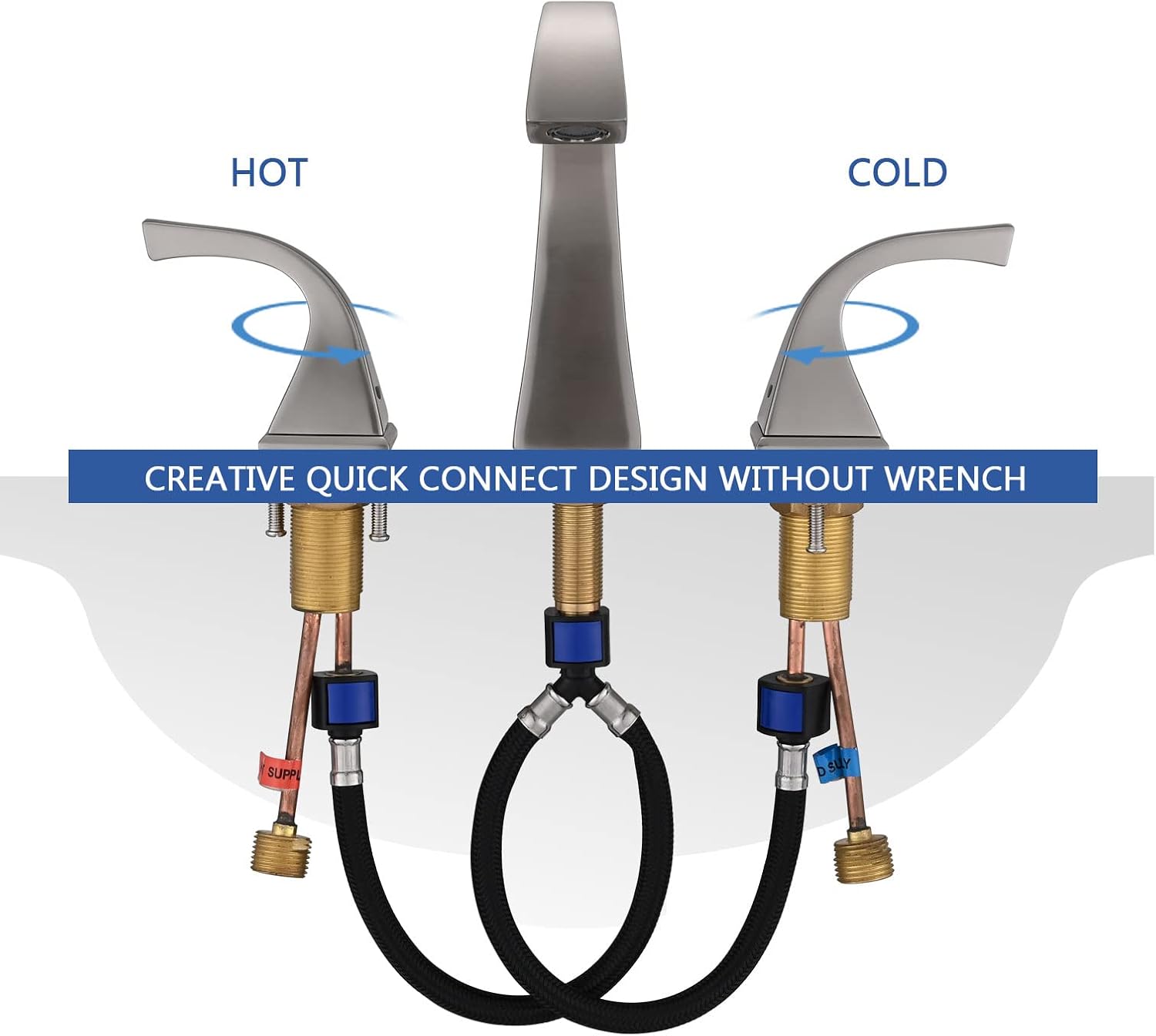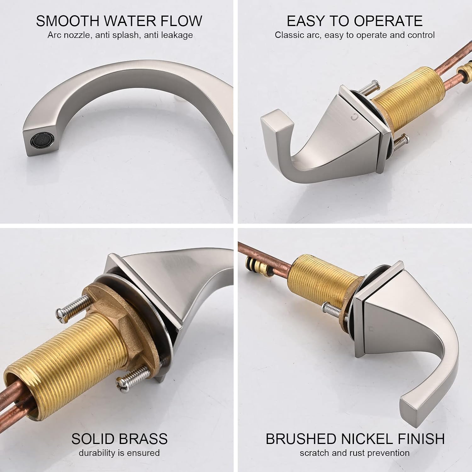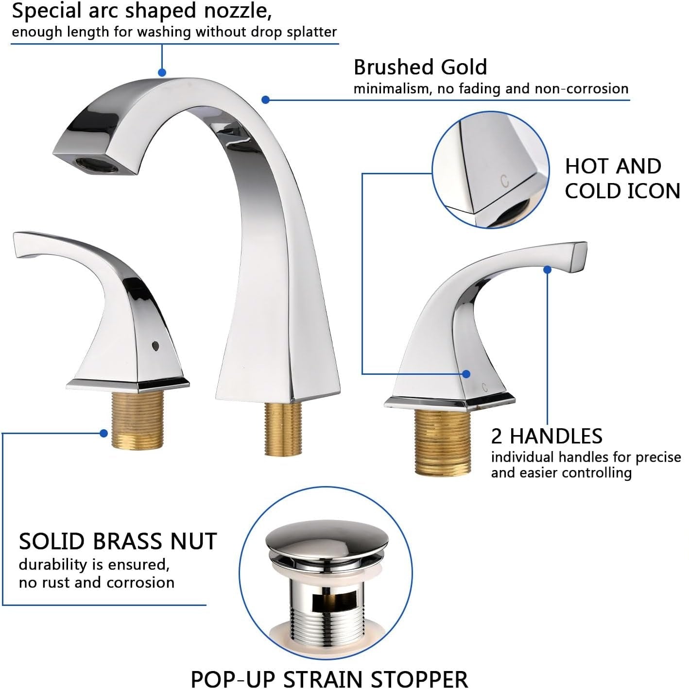 Materiales de primera calidad: Fabricado en latón macizo duradero, nuestro grifo para lavabo de baño de amplia apertura cuenta con la certificación cUPC, lo que garantiza la seguridad de su agua potable diaria. Su acabado dorado cepillado no solo realza su atractivo estético, sino que también resiste eficazmente arañazos, corrosión y deslustre. Diseño de amplia apertura: Diseñado según las normas estadounidenses, es apto para configuraciones de amplia apertura de 3 orificios y 8". Equipado con un aireador NEOPERL para un flujo de agua suave y sin salpicaduras. Diseño de dos manijas: El grifo cuenta con un práctico diseño de dos manijas que permite un control preciso del volumen y la temperatura del agua. Los cartuchos cerámicos antigoteo garantizan un flujo de agua uniforme y permiten ajustes de temperatura independientes.