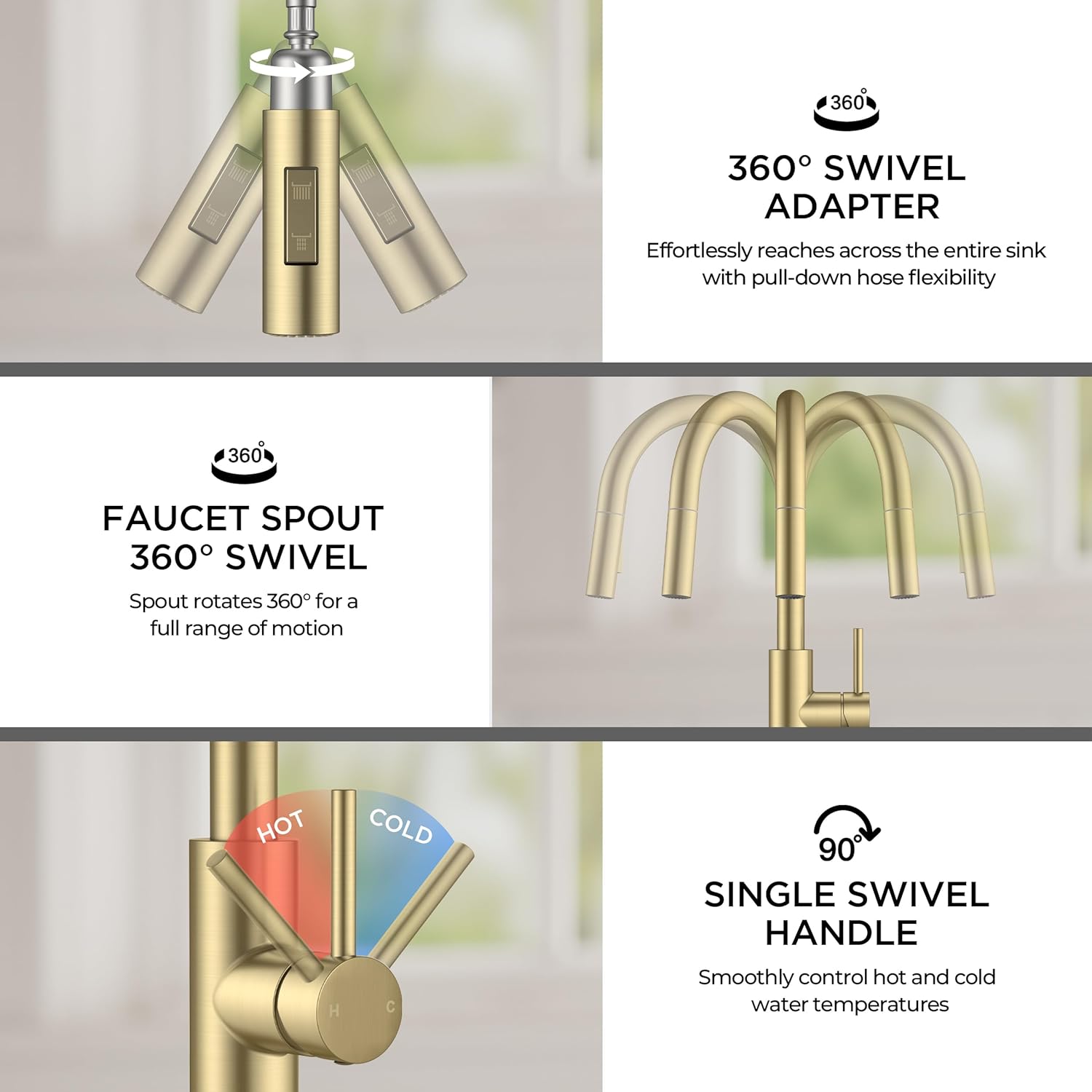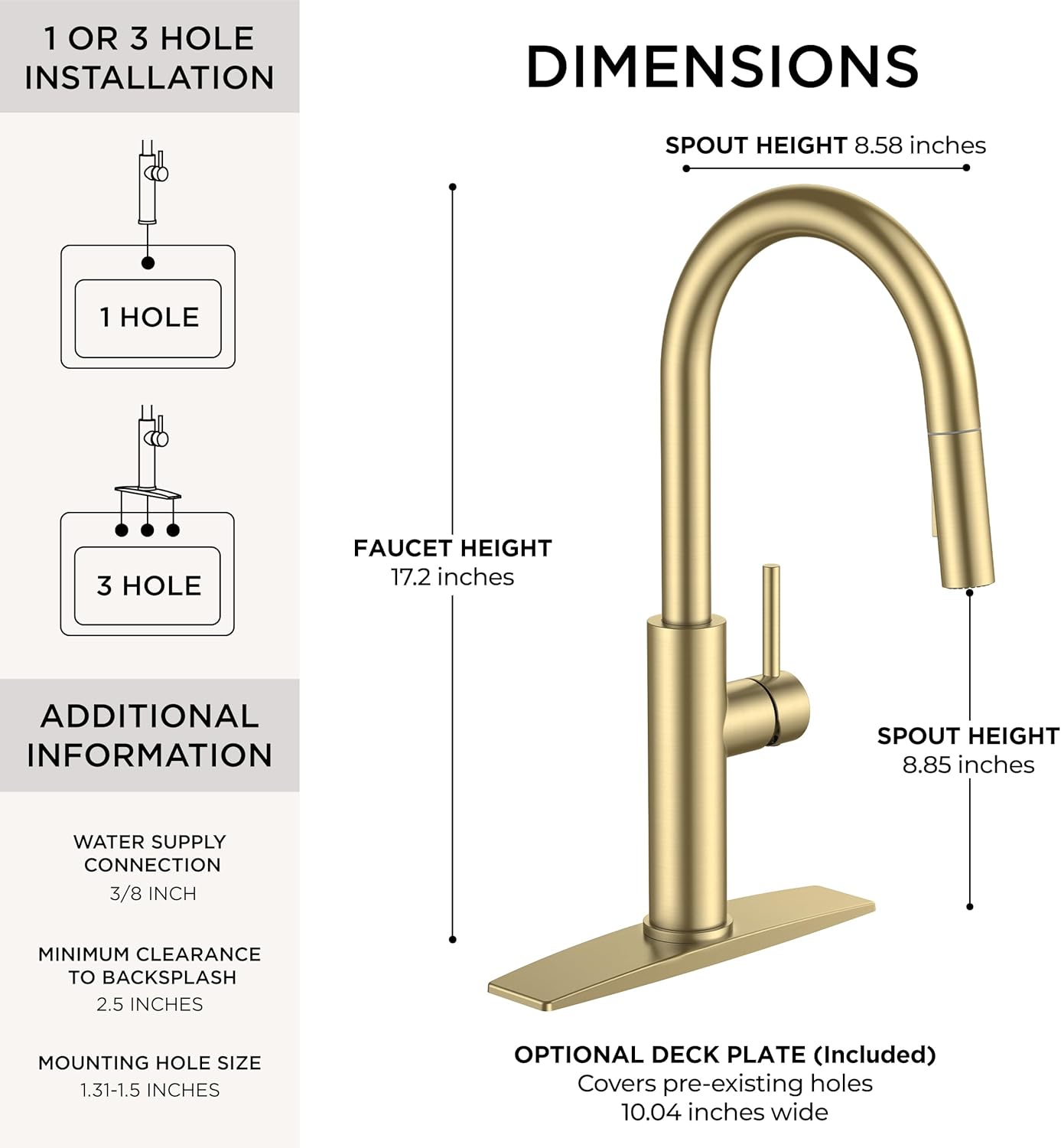 - Boquilla de arco alto e instalación flexible: con un diseño aerodinámico de arco alto, el grifo de cocina dorado cepillado FORIOUS añade un toque moderno y atemporal a cualquier cocina. Incluye una placa de cubierta opcional para configuraciones de fregadero de 1 y 3 agujeros, lo que garantiza una instalación fácil y versátil.