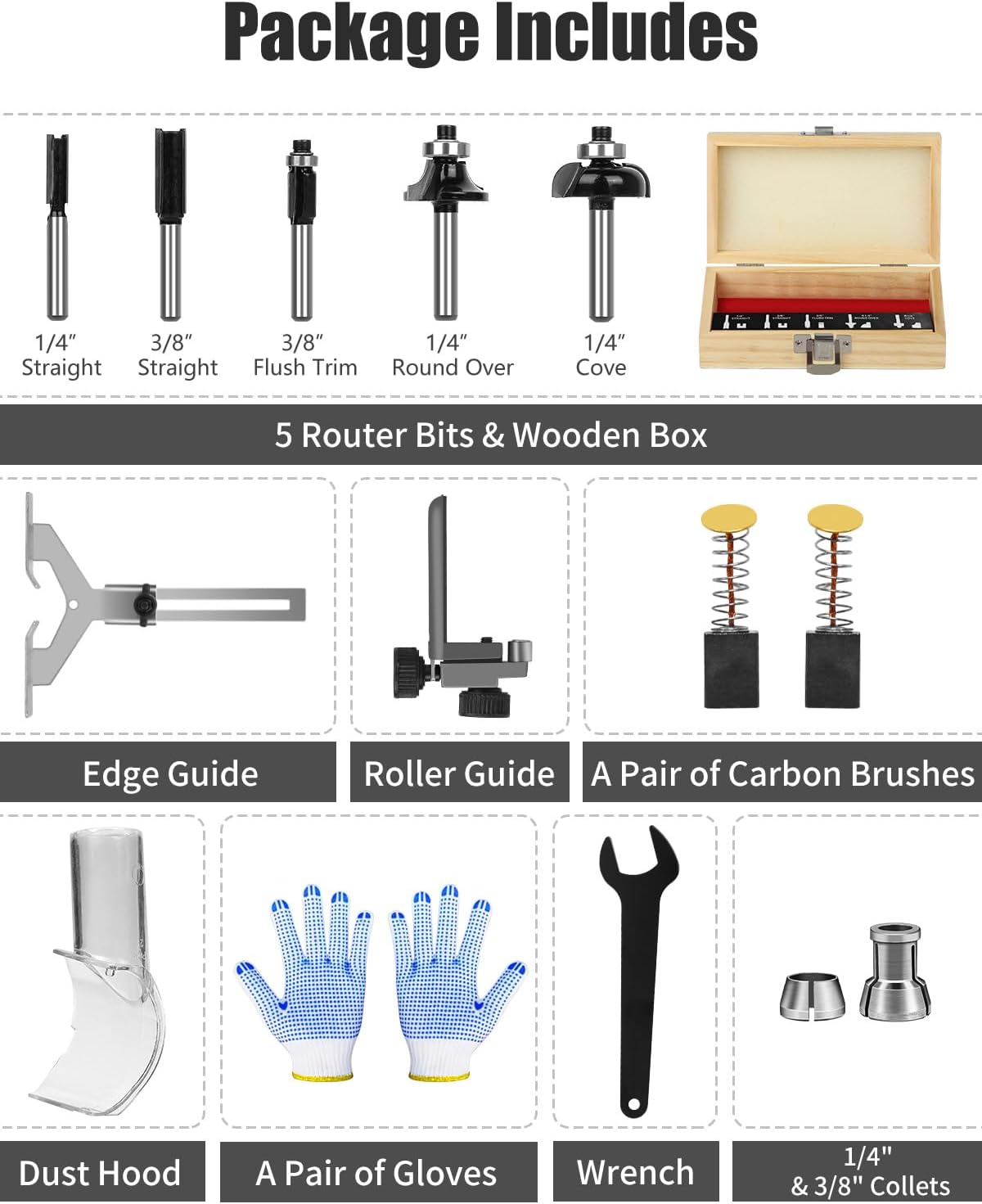 - El paquete incluye: herramienta de enrutador compacto de 1.25 HP con cable de 12.1 pies/3.7 m, 5 brocas de enrutador, guía de borde, guía de rodillo, campana antipolvo, pinza de 3/8 pulgadas y 1/4 pulgadas, llave inglesa