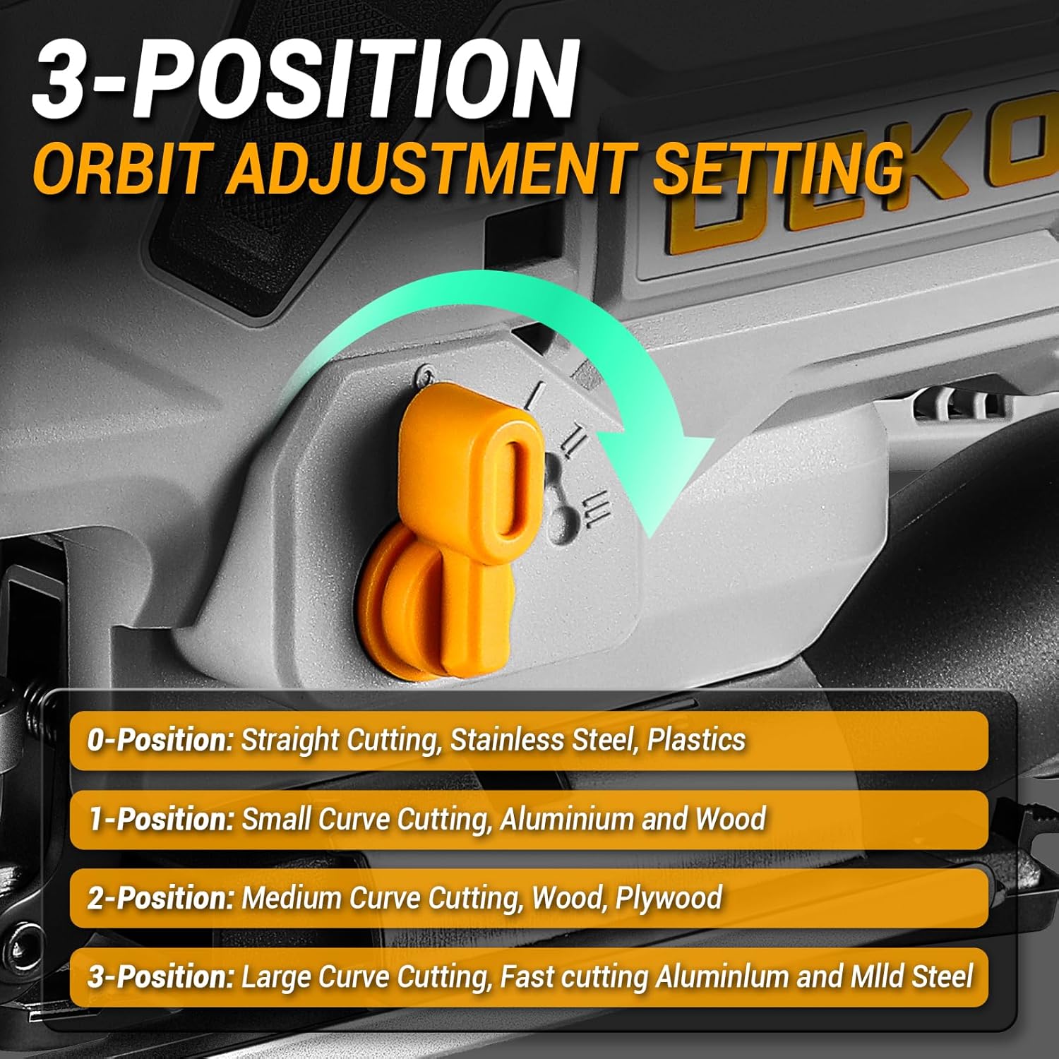 Personaliza tu velocidad de corte y patrón con 6 velocidades variables (0-2800 RPM) y acción orbital de 4 posiciones. Perfecto para cortes rectos o curvados precisos en madera, metal y plástico.