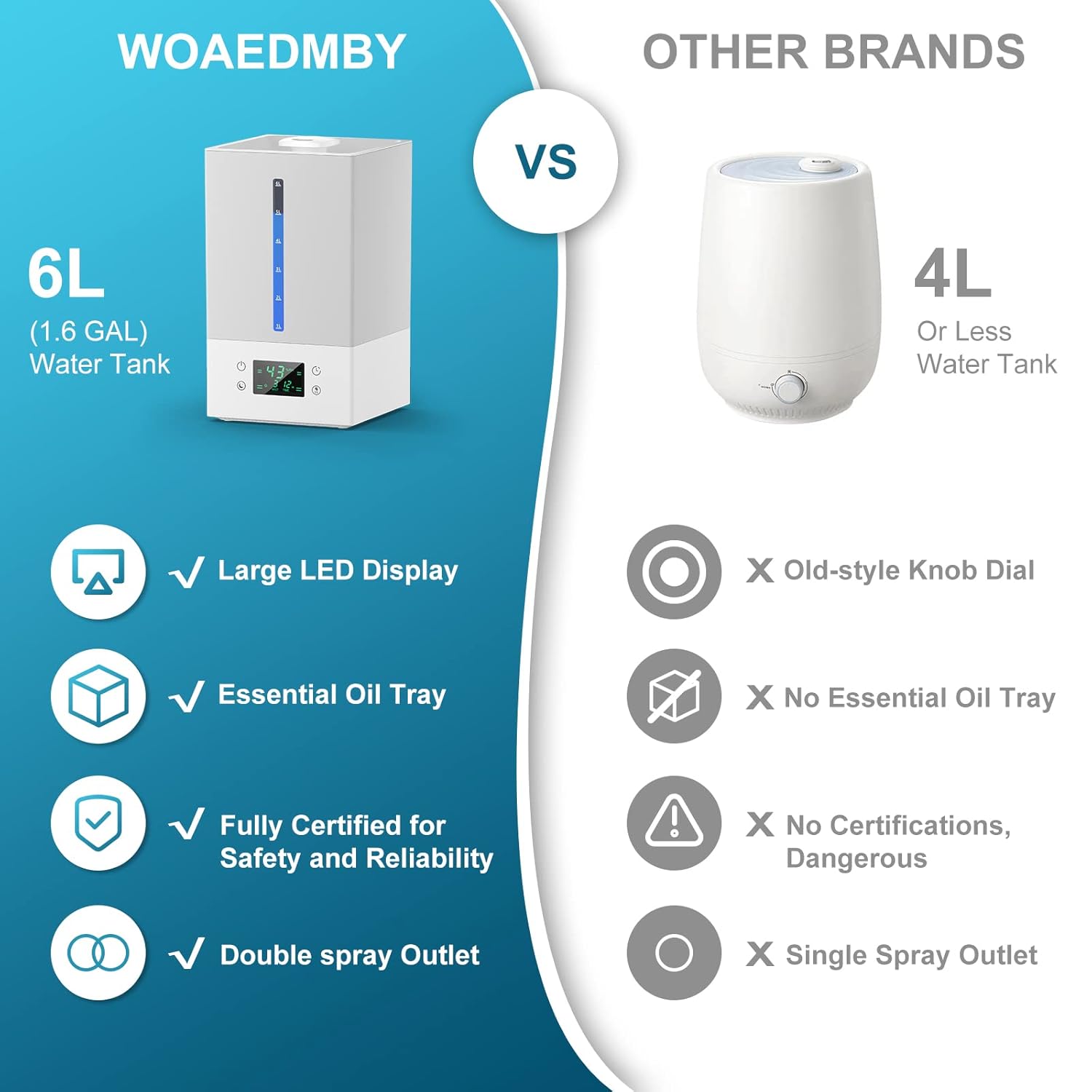 - Gran capacidad y larga duración: Diseño con un tanque de agua de gran capacidad de 6L y 3 niveles de niebla, permite humidificar continuamente hasta 50 horas, ahorrándote el problema de recargas frecuentes. Y el elegante aspecto de forma cuadrada es una gran adición a tu hogar. La boquilla de 360 grados también garantiza una cobertura completa y control direccional de la niebla.