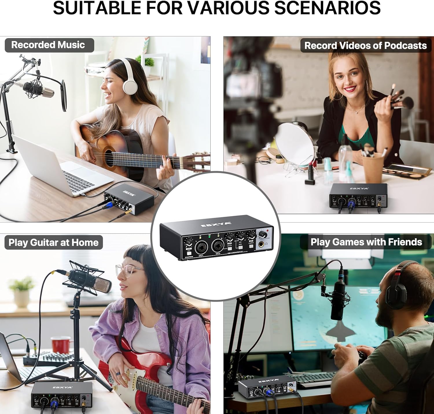 - Claridad de sonido inigualable: experimenta un audio nítido con nuestra interfaz de audio. Cada nota se reproduce con una precisión asombrosa, asegurando que no se distorsione. Ya sea que seas un guitarrista rasgueando acordes conmovedores, un podcaster que comparte una historia convincente, un cantante llamativo notas poderosas, un artista de voz en off que da vida a un personaje o cualquier entusiasta del audio, la interfaz de audio hará todo lo posible para reproducir perfectamente tu voz.