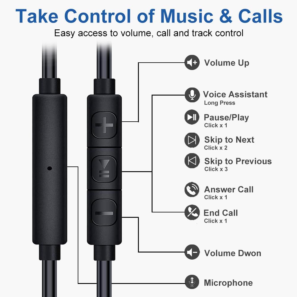 - Micrófono en línea y control de volumen: el micrófono capta tu voz con claridad, haciendo que las llamadas telefónicas manos libres y los comandos de voz sean muy fáciles sin ruidos de fondo, incluso en entornos ruidosos. No tienes que sostener el micrófono cerca de la boca para que la otra persona escuche. Los controles en línea permiten un fácil ajuste del volumen y la reproducción sin alcanzar el dispositivo, lo que es conveniente cuando se escucha música, audiolibros, podcasts, llamadas de Zoom/Equipo o llamadas de teléfono celular, etc.