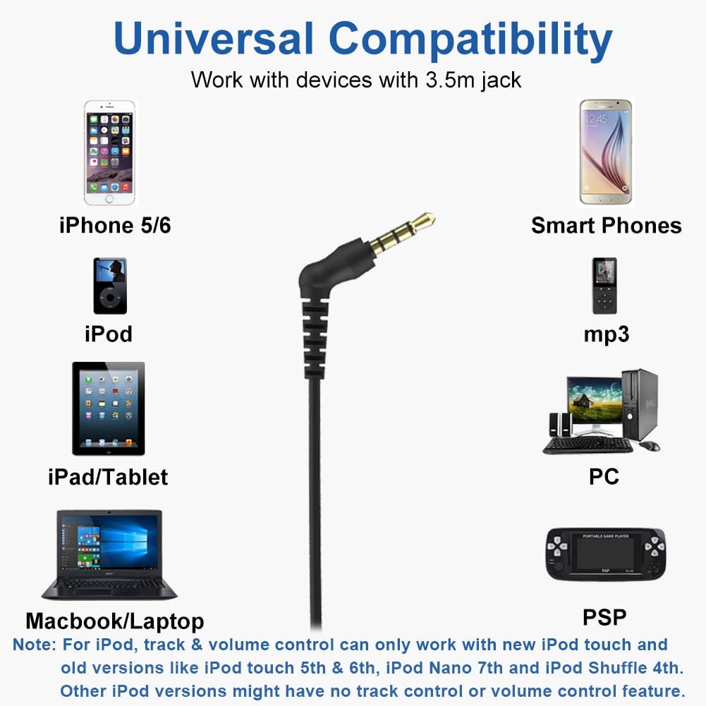 - Duradero y amplia compatibilidad: estos auriculares de conducción de aire están diseñados para durar, con cable de 52 pulgadas de grosor y resistente, enchufe reforzado y resistente al sudor. También incluye una funda de transporte para una fácil portabilidad y almacenamiento. Compatible con iPhone, iPad, iPod, MacBook, MP3, tableta, laptop, Chromebook, computadora, teléfonos celulares, Kindle, radio, PS4, PS5 y otros dispositivos con conector de audio de 0.138 in (adaptador de iluminación o USB-C para funcionar con iPhone 7 y versión superior).