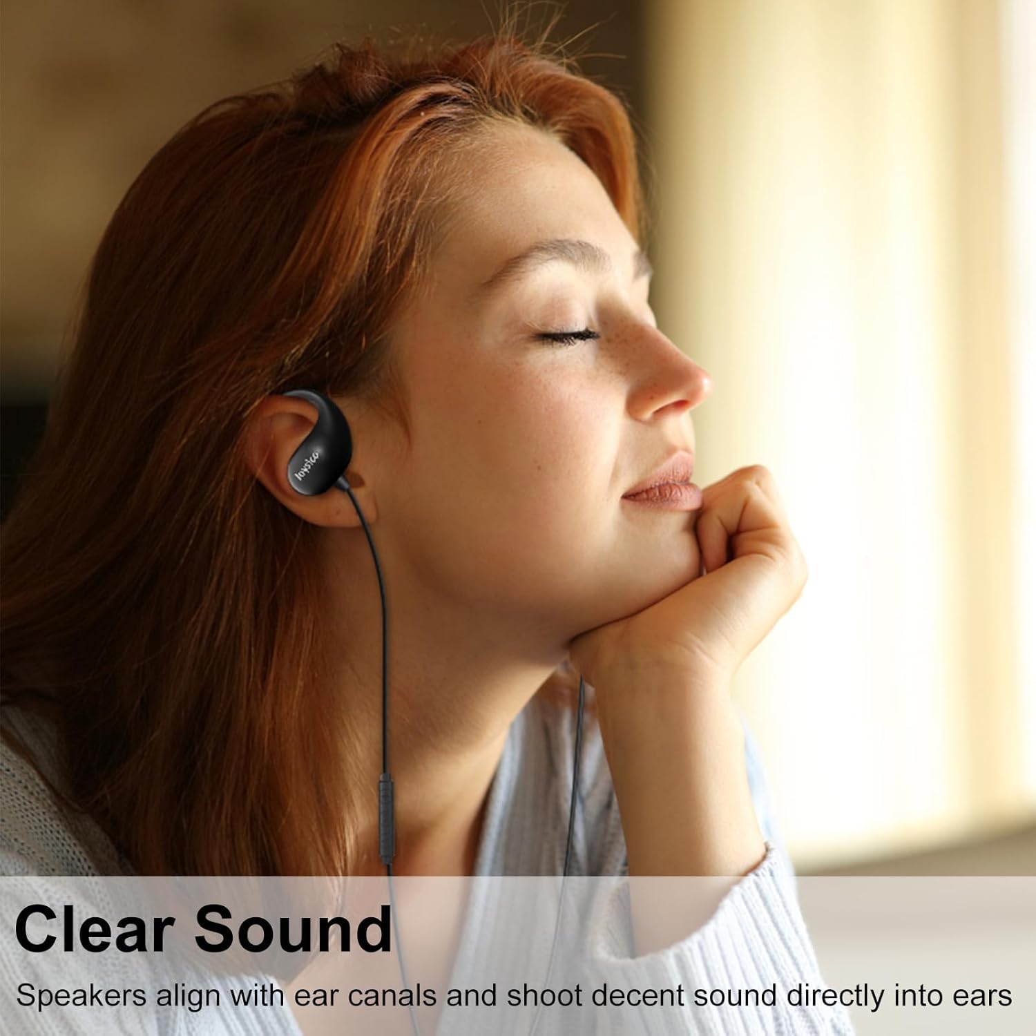 - Buen equilibrio entre audio claro y sonidos ambientales: los altavoces de 0.551 in están alineados con los orificios para las orejas por los bucles envolventes para las orejas y disparan un sonido claro y fuerte en tus oídos, con poco sonido sangra a los demás a tu alrededor. Haz que parezca que el sonido estéreo está a tu alrededor mientras aún puedes escuchar el entorno sin fatiga auditiva. También es adecuado para personas que desean ahorrar audición, ya que no emite música fuerte directamente en sus tímpanos como en los auriculares. No para uso bajo.