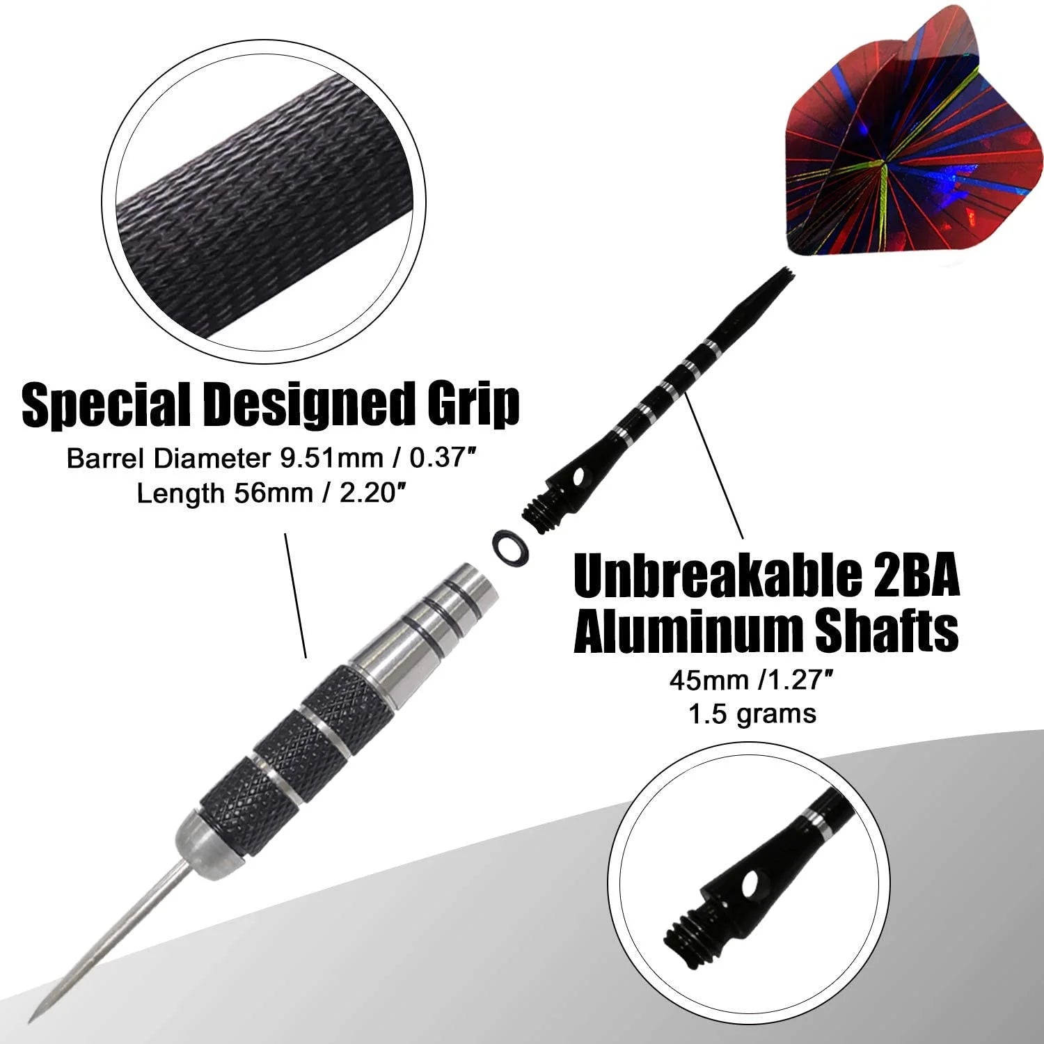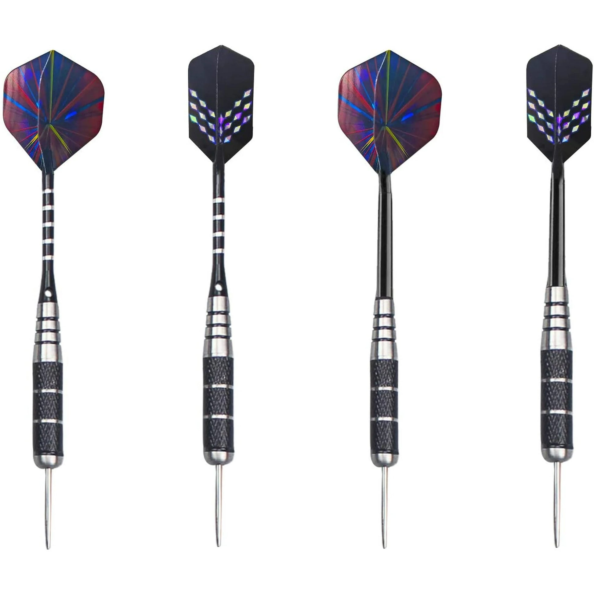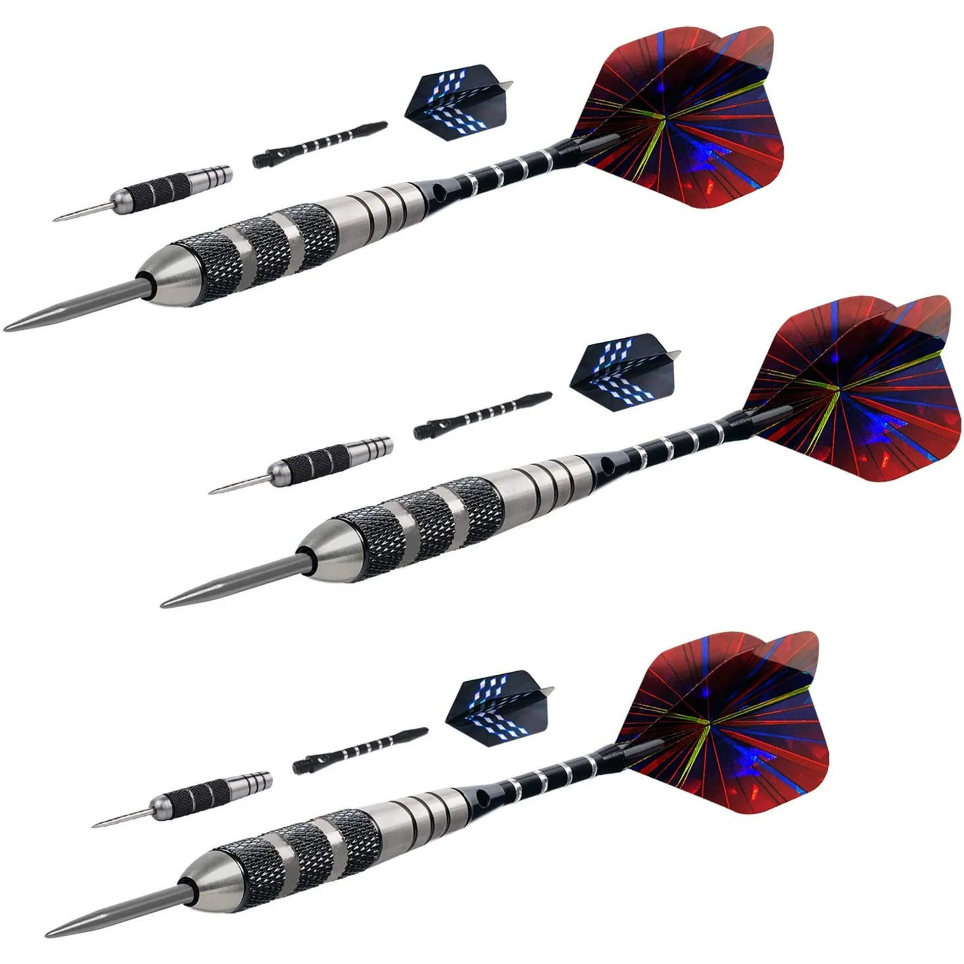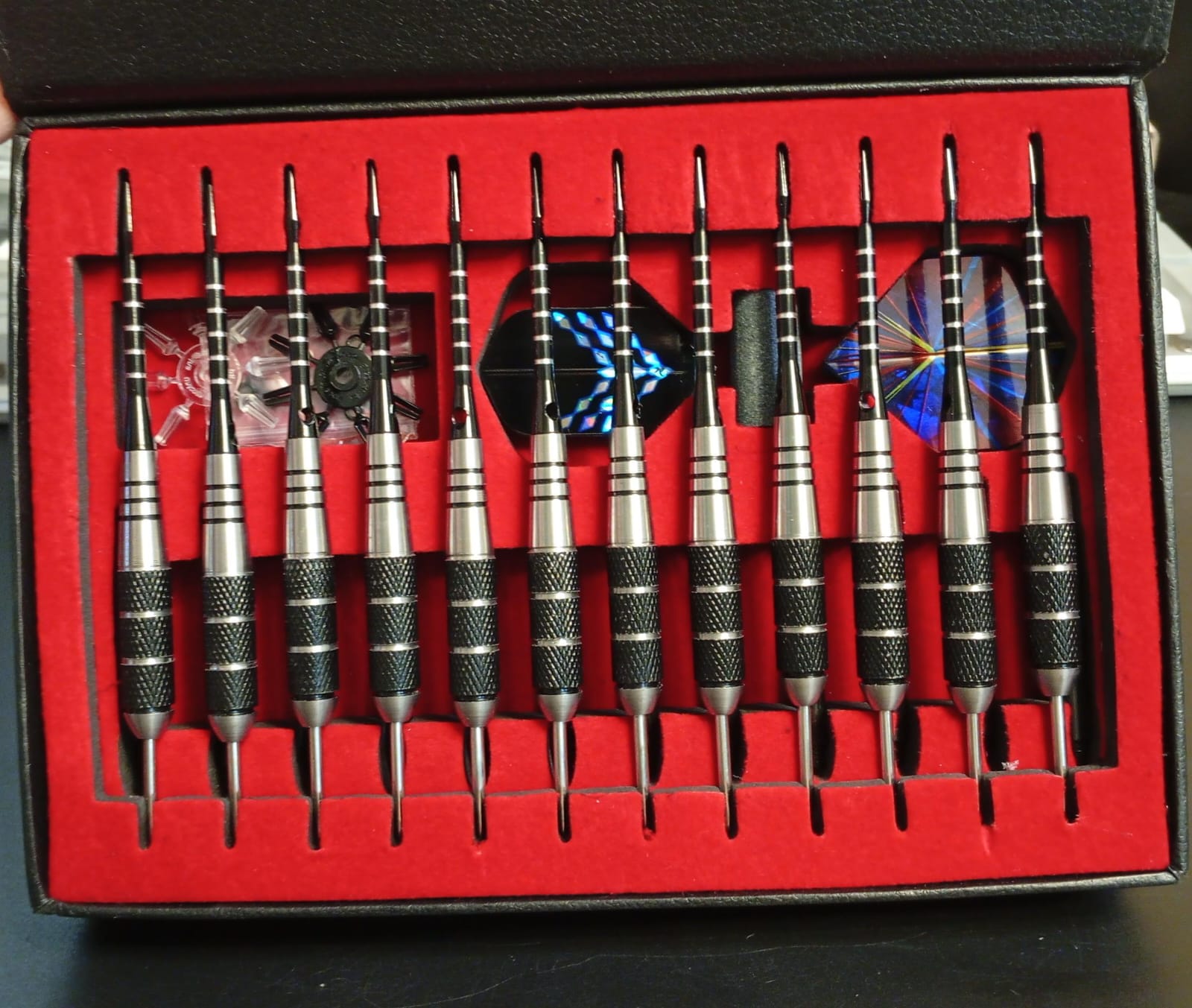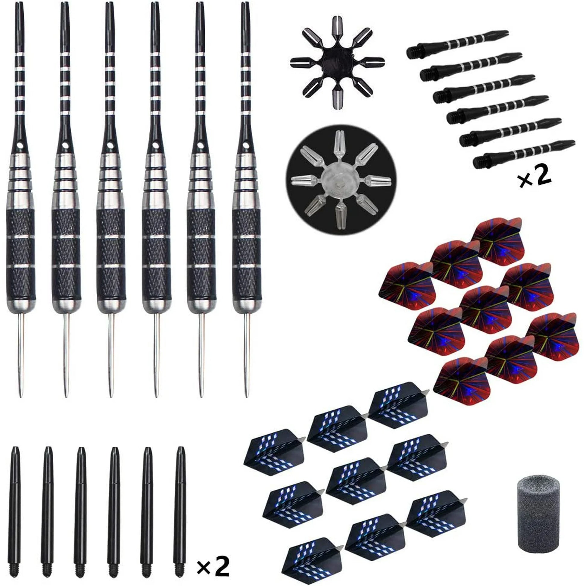 El juego de dardos incluye: 12 dardos de 22 g + 12 ejes de plástico + 18 vuelos estándar en dos estilos diferentes + 1 afilador de dardos + 1 hermosa caja de regalo.