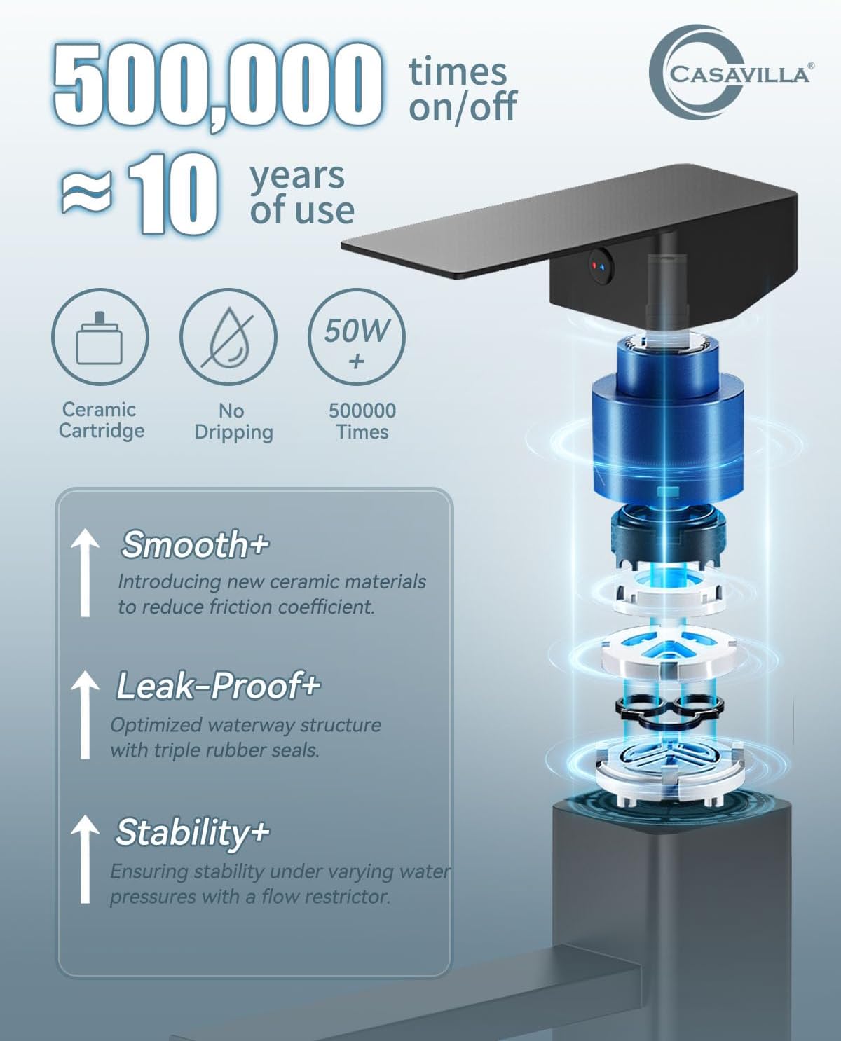 Manija monomando inteligente para controlar fácilmente la temperatura y el caudal del agua. Este moderno grifo de lavabo incorpora un cartucho de disco cerámico comercial de alto sellado, que ha superado pruebas de 500.000 ciclos, lo que garantiza un rendimiento profesional y duradero sin goteo para grifos de baño. Le proporciona un flujo de agua suave y con baja probabilidad de fugas. Cree un ambiente de baño cómodo y seguro.