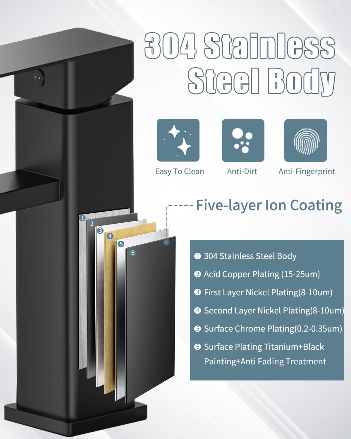 Productos forjados en acero inoxidable SUS 304 sin plomo. El tratamiento superficial en negro mate con un contenido de cromo/níquel 18/8 añadido proporciona un acabado anticorrosivo y antioxidante superior que evita que la suciedad, como huellas dactilares o manchas de agua, se adhiera a la superficie del grifo, dejando el baño con un aspecto más limpio. La limpieza diaria con un paño o agua es suficiente; menos tiempo limpiando y más tiempo disfrutando con la familia.
