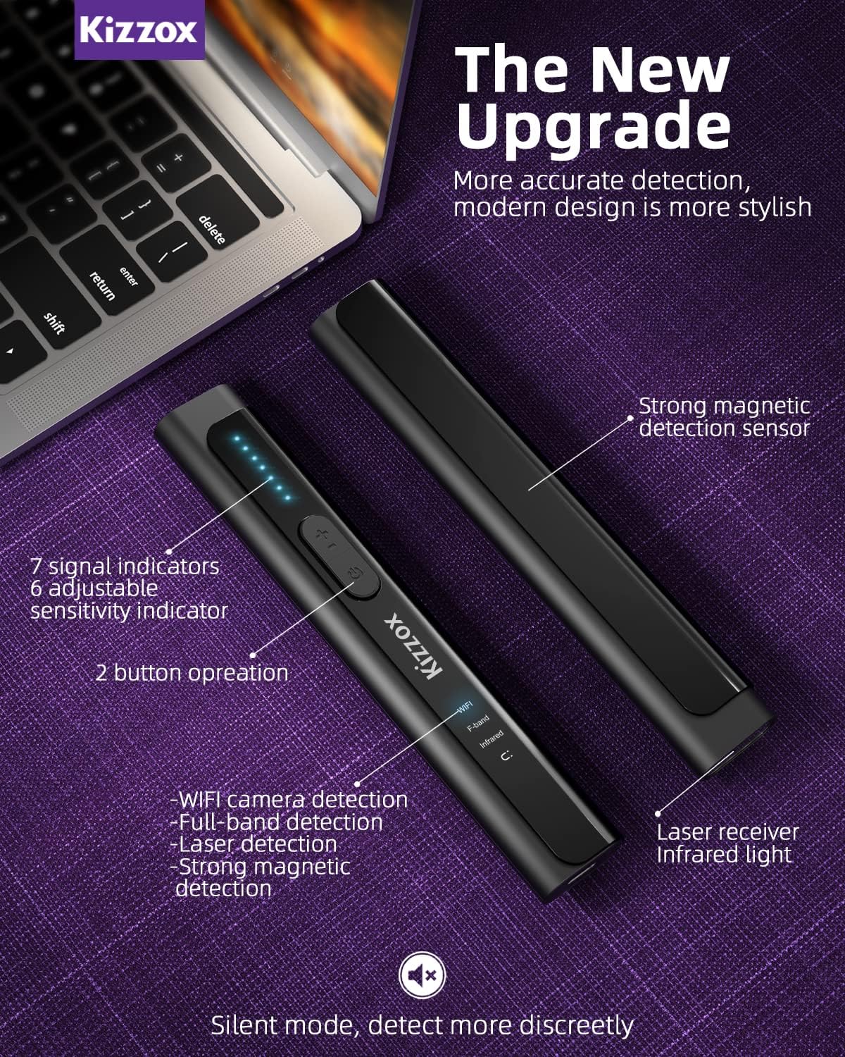 - Detector avanzado de dispositivos ocultos: el detector de cámara Kizzox K16 Pro es una nueva actualización de la precisión de detección y aspecto único elegante basado en el rendimiento reconocido por los usuarios.