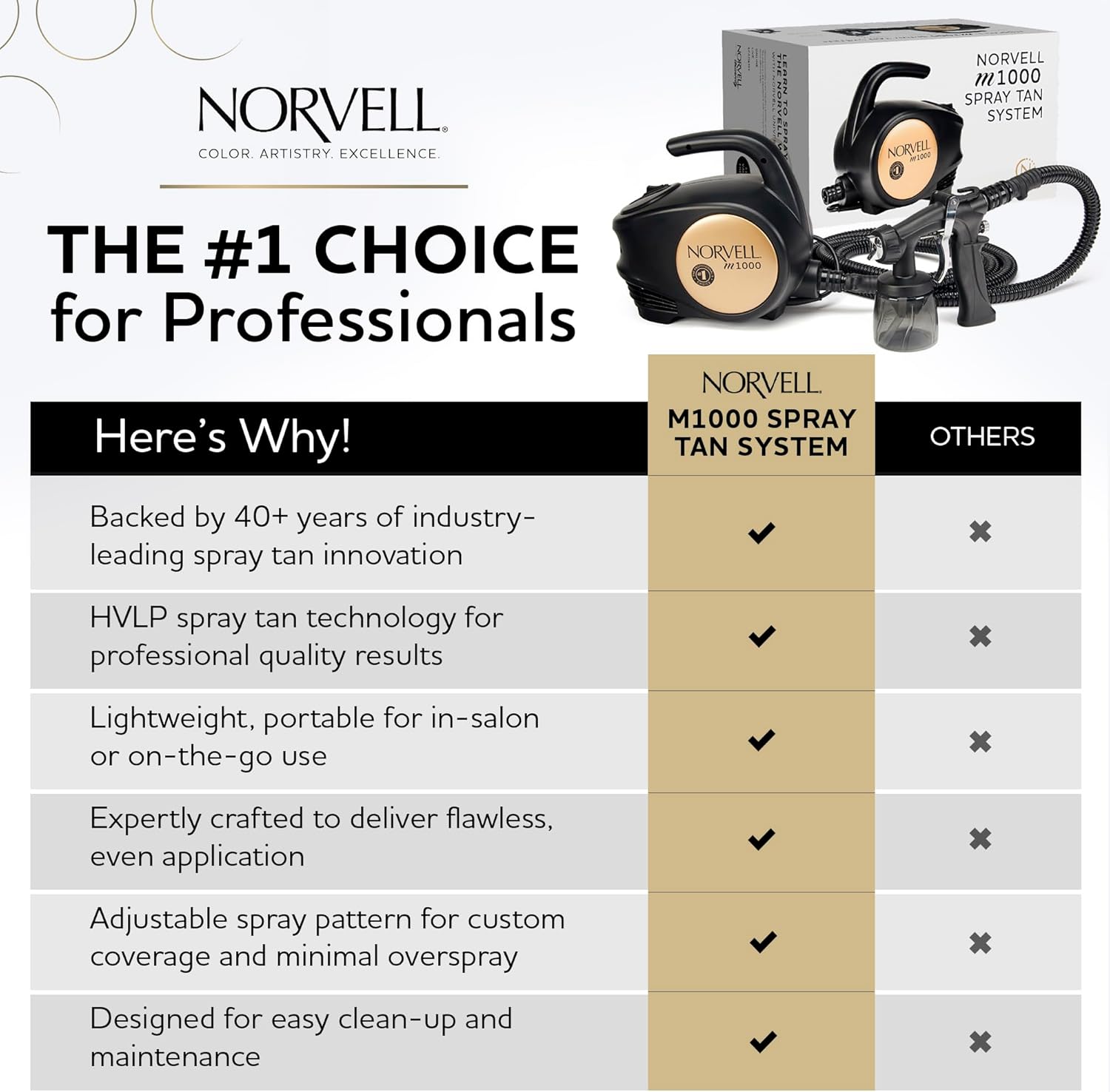 - El paquete incluye: sistema de pulverización móvil Norvell M-1000 HVLP; Norvell Tanning Hand Solutions - Ultra Vivid 'Cosmo' 8oz, veneciano 8oz y oscuro ABIERTO.