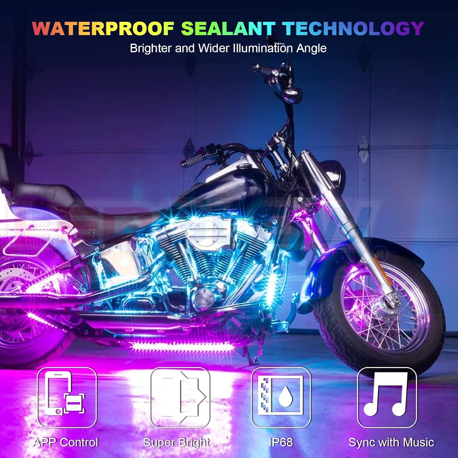 - Super brillante: el kit de luz LED para motocicleta está diseñado con chips LED RGB 5050 SMD 3 en 1, haciendo que tu motocicleta se vea increíble con millones de combinaciones de colores. 8 luces de cápsula en 2 cinturones LED y 96 chips de luz LED, cada chip de luz LED para motocicleta es impermeable y de color brillante, mejorando la visibilidad cuando se conduce por la noche. IP 68 resistente al agua te hace viajar seguro por la noche, incluso se puede utilizar en días lluviosos intensos