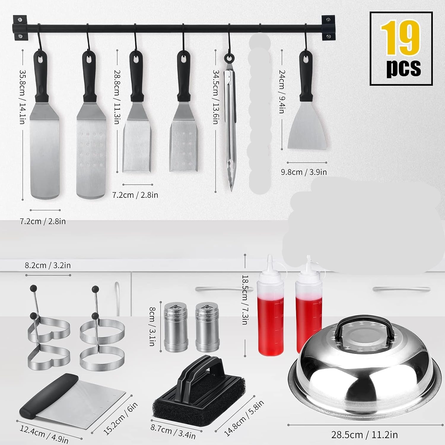 - Kit de accesorios profesionales para plancha de 19 piezas: ¿Quieres sentirte como un verdadero profesional de la barbacoa y poner celosos a tus vecinos? Los accesorios de parrilla de parte superior plana para Blackstone te proporcionan una formidable colección de arsenal para parrilla.