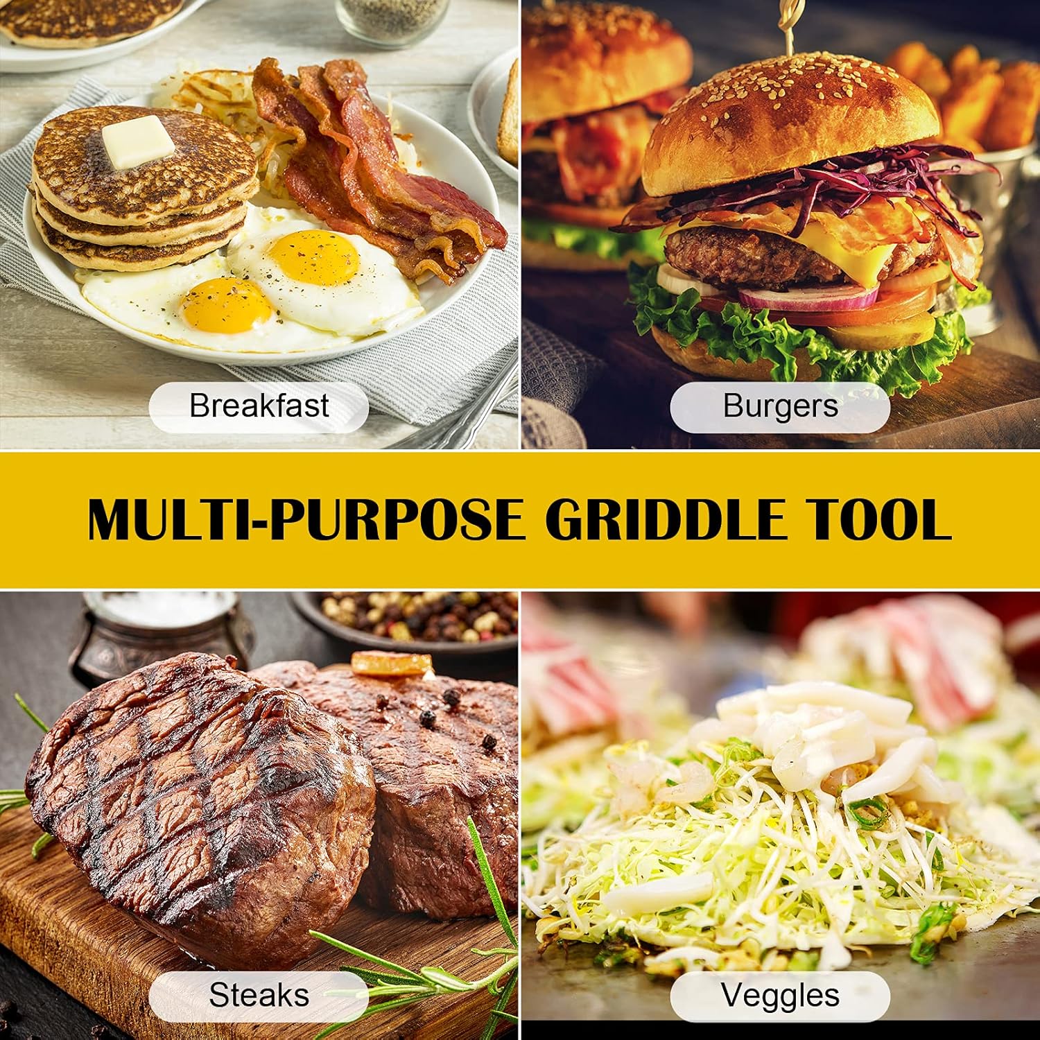 - Accesorios multiusos para plancha plana: este juego de plancha es el complemento perfecto para cualquier cocina de patio trasero. Todos los accesorios realmente pueden mejorar tu experiencia de plancha. Este kit de herramientas de parrilla profesional hace que cocinar para una multitud sea muy fácil, desde el desayuno hasta hamburguesas, filetes de queso y verduras. Ideal para la cocina diaria, cocina en el patio trasero o tu próxima aventura de campamento. Muestra tus habilidades culinarias y prepara comidas sabrosas con este kit de accesorios de plancha plana.
