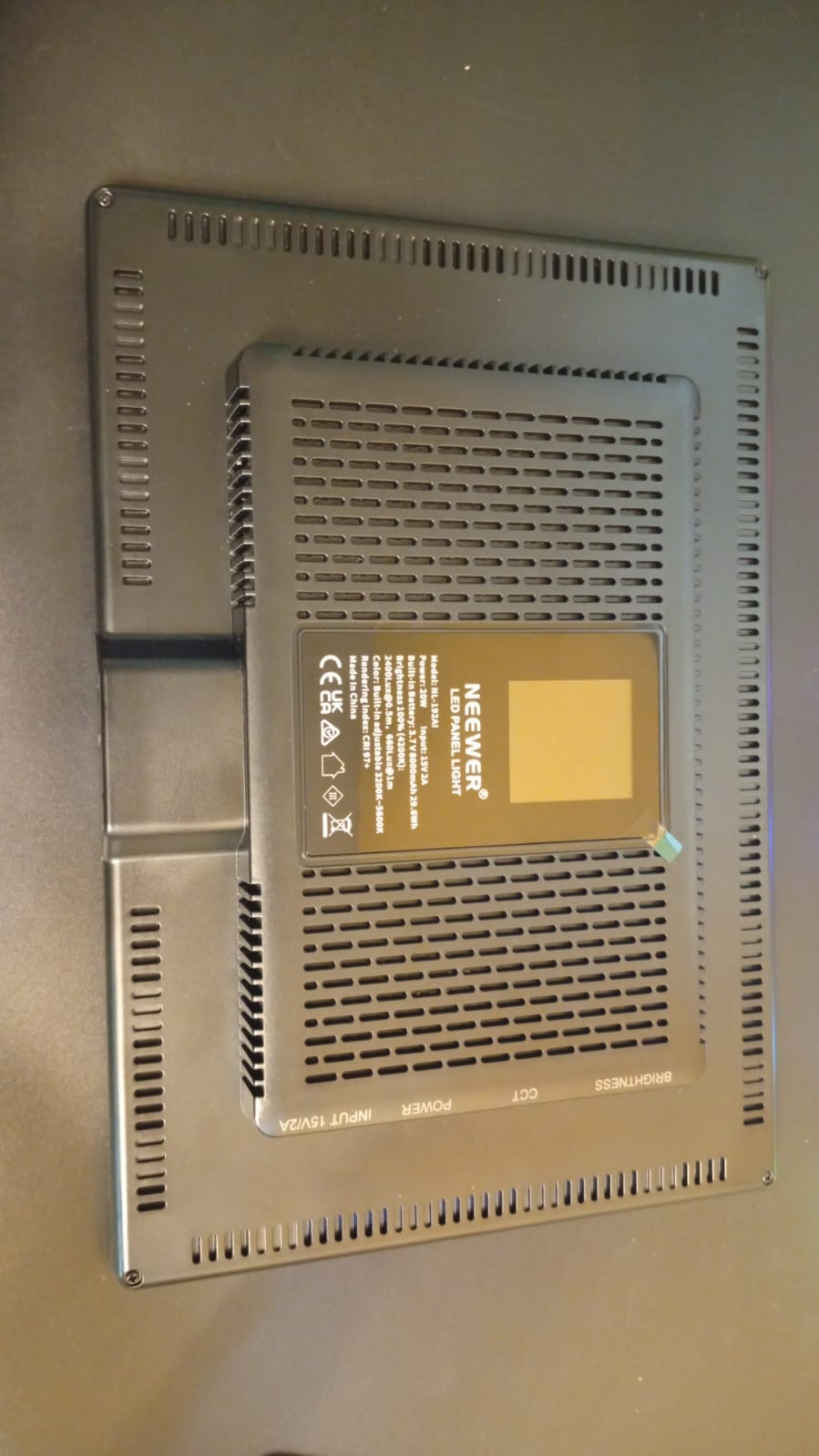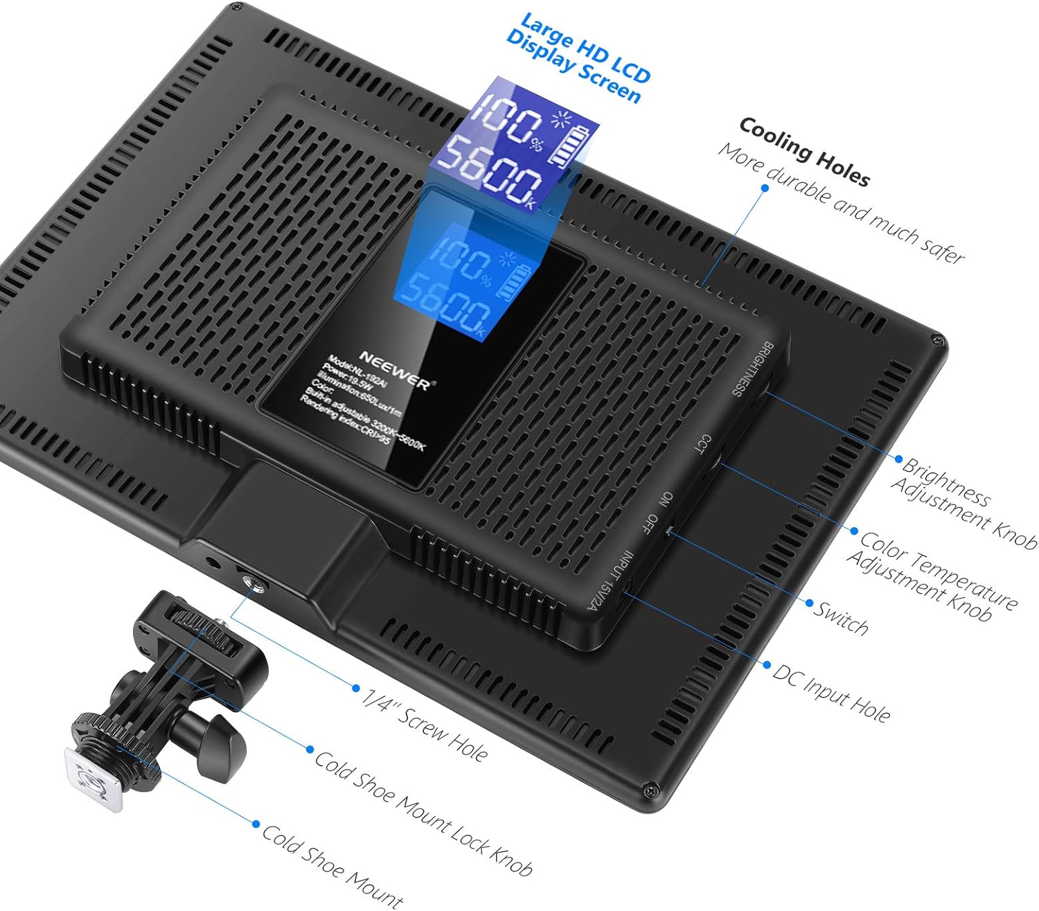 - Pantalla LED ultrafina: el panel de luz LED es delgado y ligero para un fácil transporte con un grosor de solo 0.4 in. Peso del panel: 1.3 libras/20.46 oz; Tamaño del panel (sin cabeza de bola): 10.55x7.4x1inches/26.8x18.8x2.6centímetros. Con una gran pantalla LCD en la parte posterior del cabezal de luz, mostrará claramente la temperatura de color, el brillo y el estado de energía de la batería de la luz.