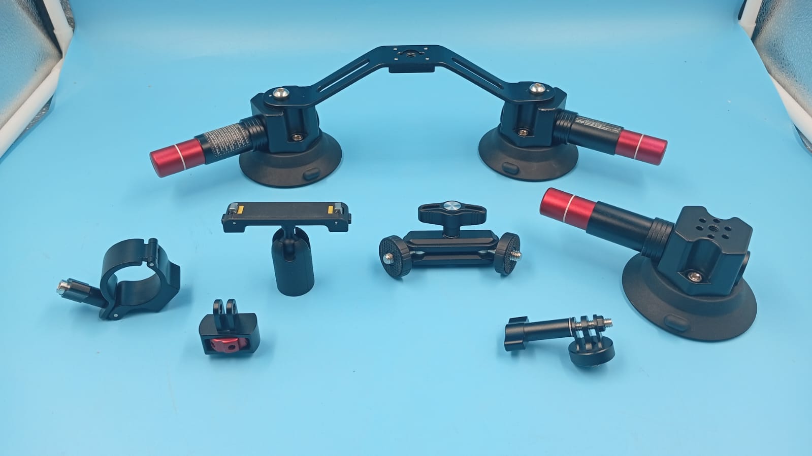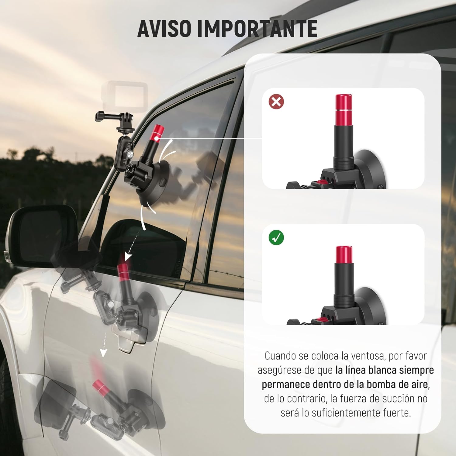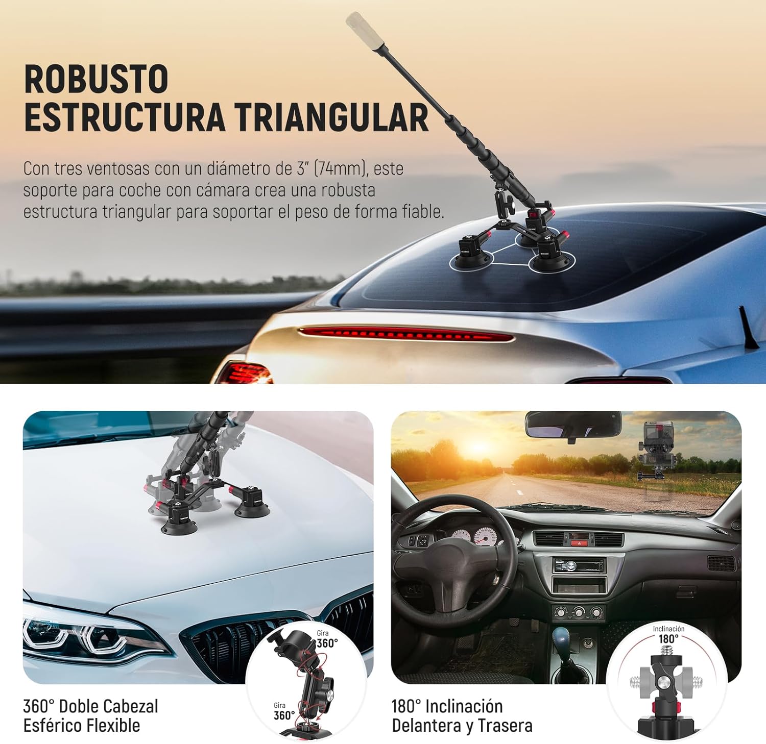 - Triple Ventosa de Montaje para Coche Kit: Capture ángulos de conducción únicos desde el capó del motor, el parabrisas o el lado del automóvil para obtener imágenes inmersivas en la carretera. Este soporte de cámara con ventosa fija de forma segura su cámara de acción con tres potentes ventosas, y colóquela utilizando los postes de extensión y el brazo mágico de cabeza esférica para varias perspectivas de disparo.
