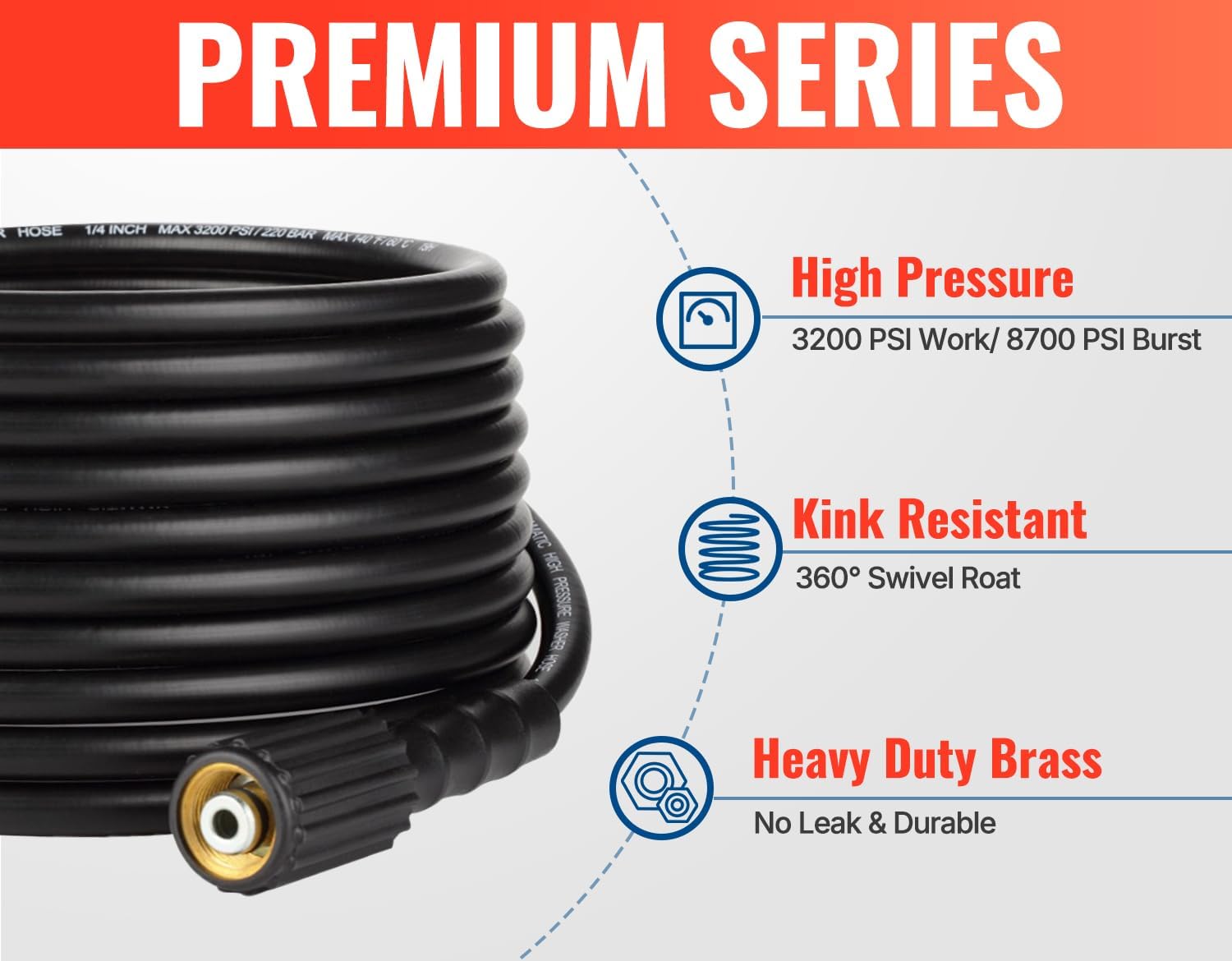 - Manguera de lavado a presión resistente a las torceduras de 3200 PSI: la manguera de material de alta calidad se fusiona con un proceso de fabricación único de alta tecnología para proporcionarte un fácil transporte, arrastre y enrollamiento. Con material innovador de alta tecnología y gestión de procesos, nueva resistencia mejorada y resistencia al desgaste, esta es la manguera de lavado a presión de repuesto perfecta para una vida útil más larga y un uso seguro.