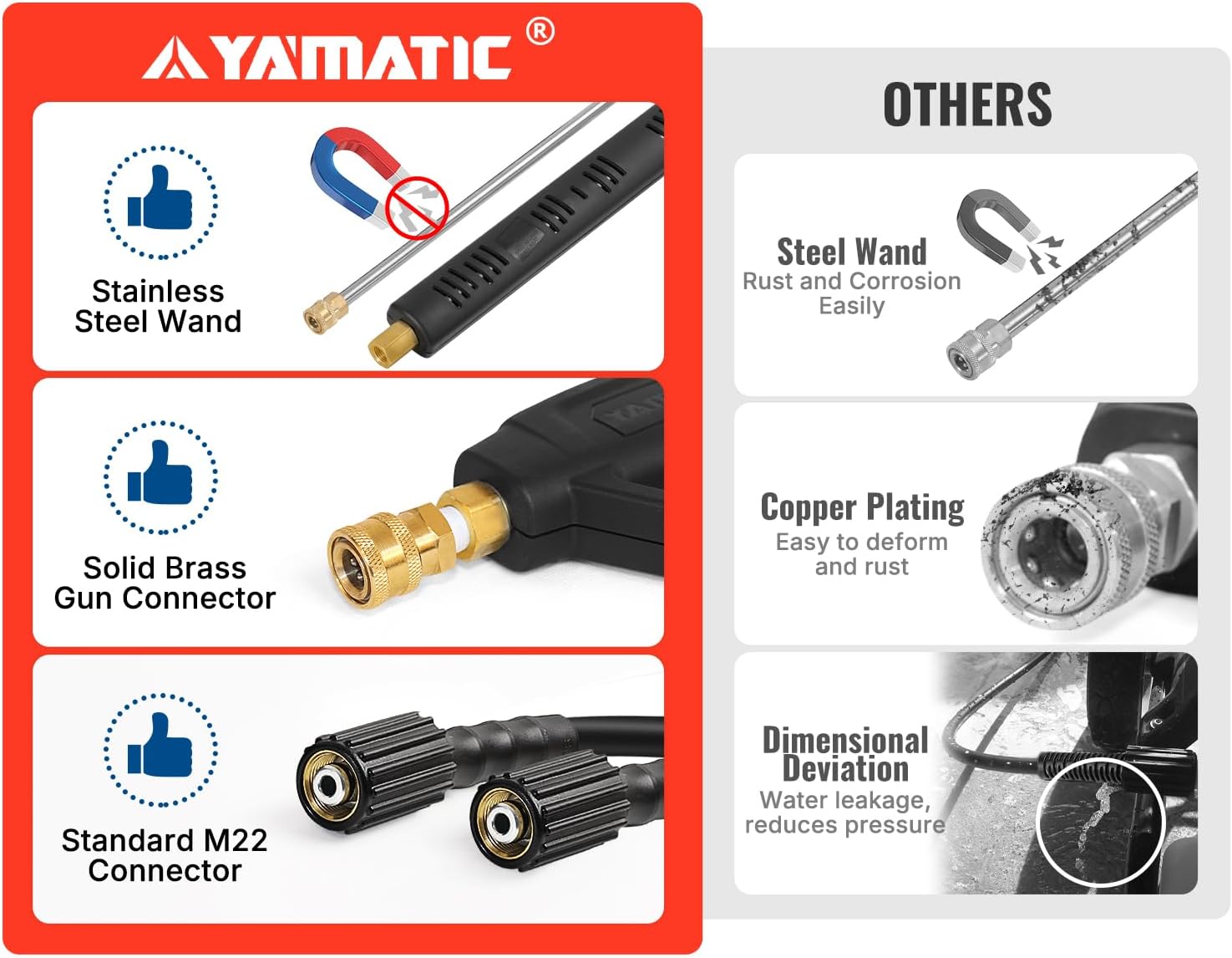 - Kit de manguera de pistola de lavado a presión: kit de pistola y varita de lavado de alta presión de 4000 PSI, viene con la manguera de lavadora eléctrica YAMATIC más popular de 3200 PSI, fácil de alcanzar a lugares difíciles de conseguir. Cumple con tus requisitos de limpieza al aire libre y lavado de negocios. Compatible con Simpson, CRAFTSMAN, Champion, Honda, Excell, Ryobi y otras lavadoras de alta presión. Nota: no apto para manguera de jardín o manguera de agua.