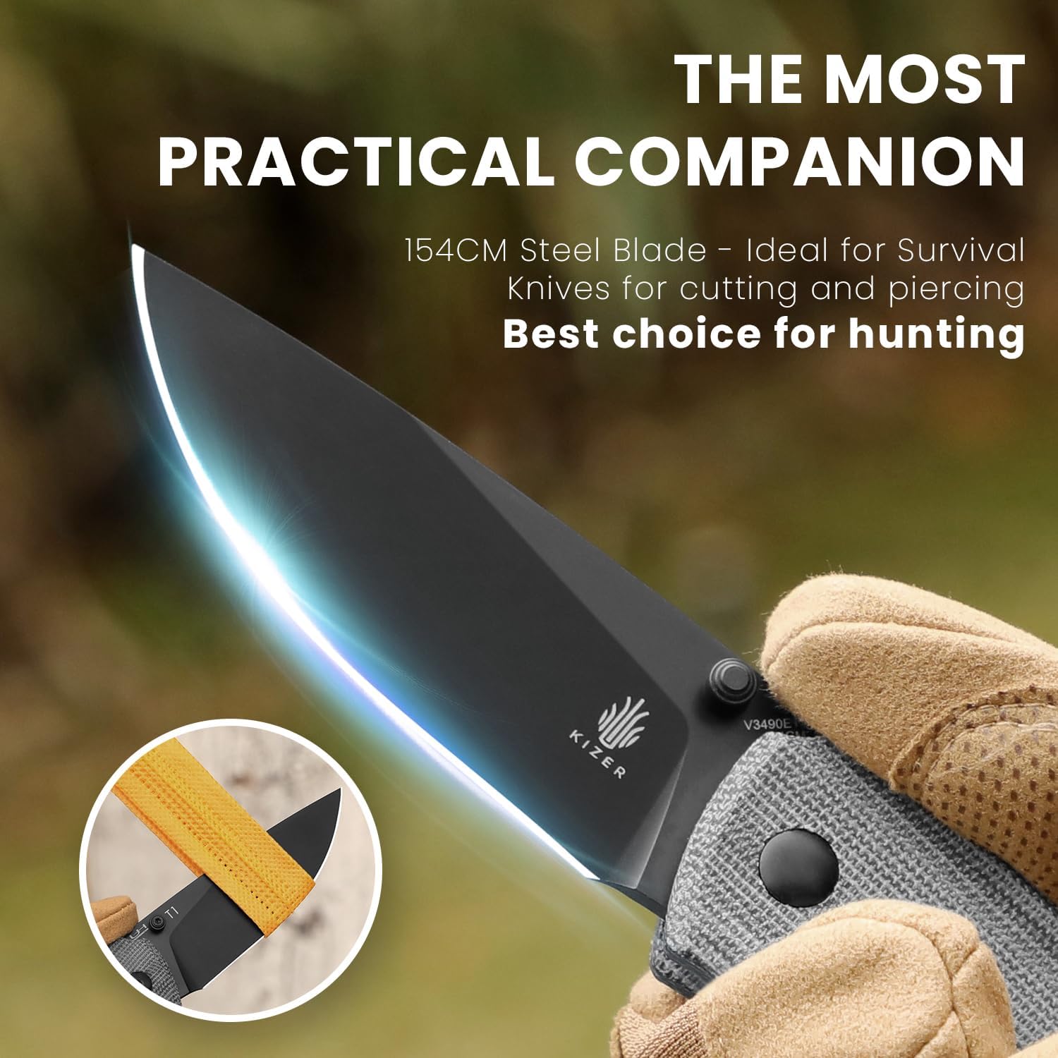 - Mango de micarta negra: el cuchillo plegable Kizer EDC para acampar cuenta con un mango Micarta negro que ofrece una durabilidad excepcional y un agarre seguro y cómodo en cualquier condición; su superficie texturizada garantiza un agarre firme para un uso seguro, mientras que un orificio para cordón en el extremo del mango agrega comodidad para un fácil transporte