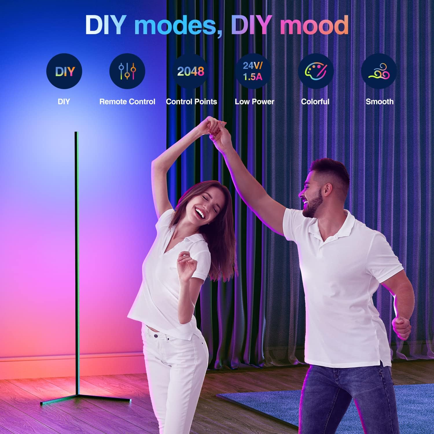 - Modos de bricolaje, estado de ánimo de bricolaje: el diseño inteligente IC se asegura de que esta lámpara de pie regulable tenga 64 efectos de iluminación. Puedes elegir modos de color único o múltiple, estáticos o dinámicos para hacer tu lámpara de pie LED.