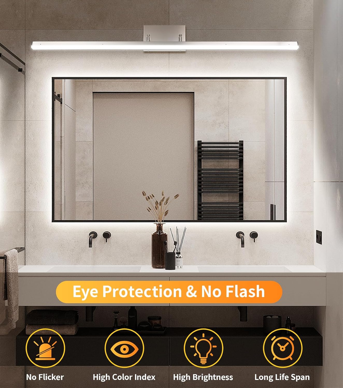 - Barra de luz de baño: arriba y abajo doble 3400lm blanco frío 5000k sobre la luz del tocador del espejo trae una mejor iluminación para su habitación. Controlador de atenuación suave compatible con la mayoría de atenuadores LED del mercado. Puedes lograr ajustar el brillo (25% -100%) con el interruptor de atenuación doméstico. (Interruptor de atenuación no incluido).